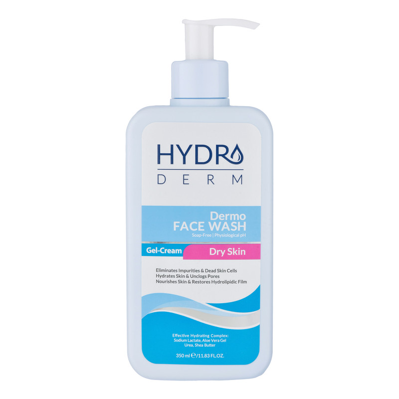 کرم ژل شستشو صورت هیدرودرم، سازگار با پوستهای خشک و حساس، با خاصیت پاک کننده آلودگی و سلولهای مرده پوست، آبرسان، بازکننده منافذ پوست، متعادل کننده چربی پوست، بدون صابون، دارای ژل آلوئهورا، اوره، شی باتر، سدیم لاکتات، حجم 350 میلیلیتر، مدل Dermo