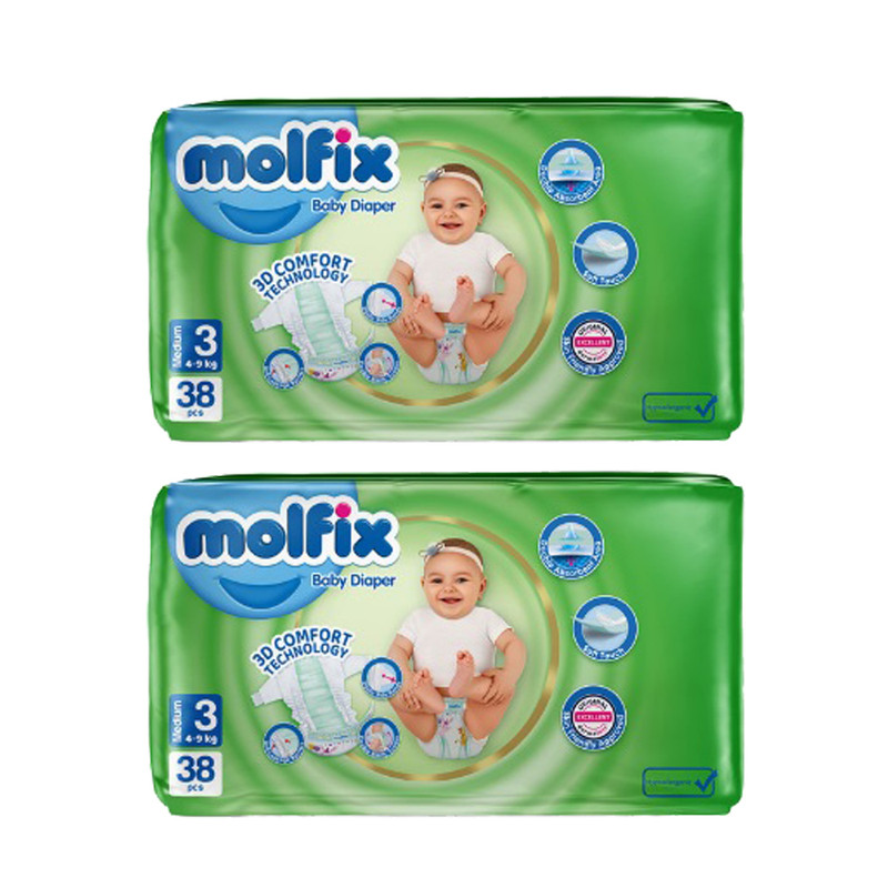 پوشک بچه مولفیکس مدل چسبی کد 32 سایز ۳ دو بسته ۳۸ عددی
