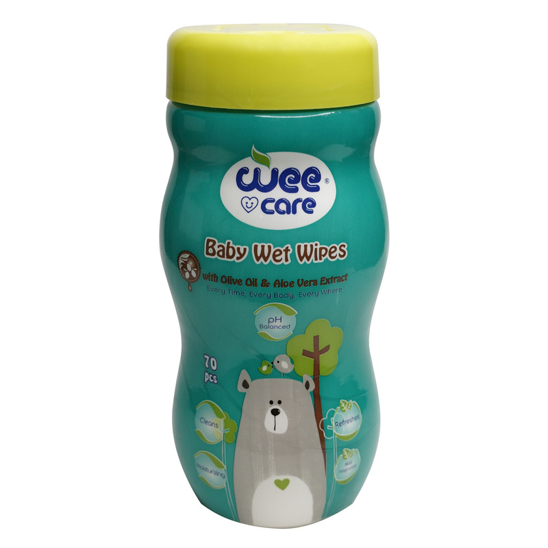 دستمال مرطوب کودک وی کر مدل عصاره آلوئه ورا و روغن زیتون سیلندری بسته 70 عددی