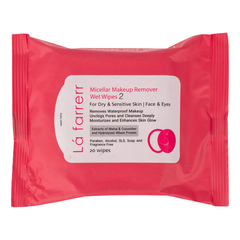 دستمال مرطوب پاک کننده آرایش چشم و صورت لافارر مدل 02 مناسب پوستهای خشک و حساس بسته 20 عددی