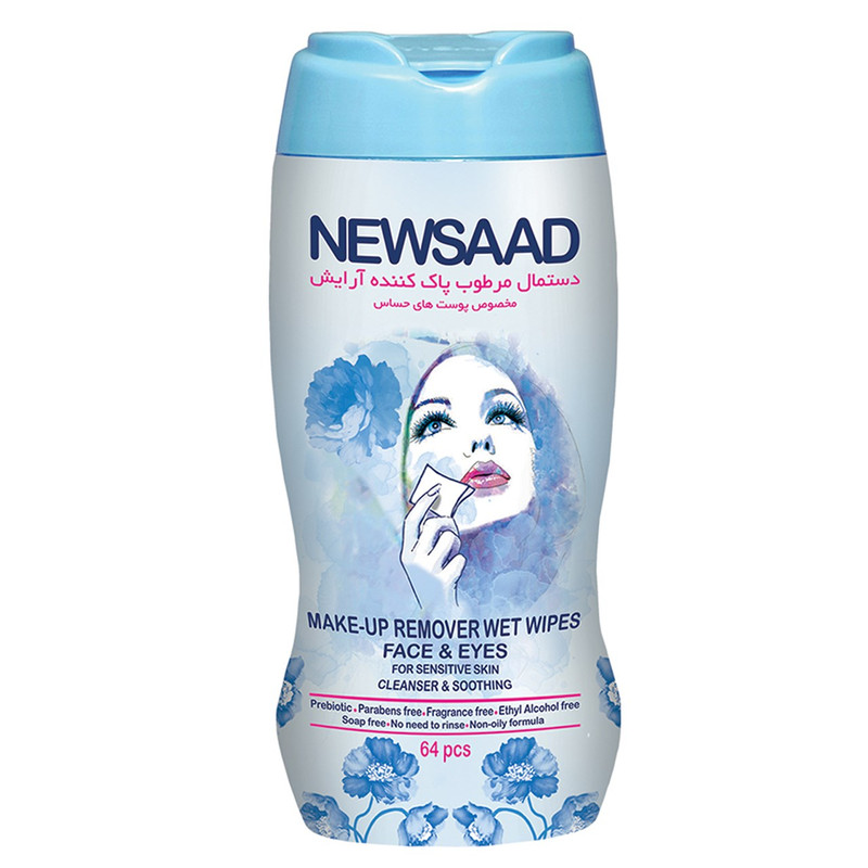 دستمال مرطوب پاک کننده آرایش نیوساد مدل Sensitive بسته 64 عددی