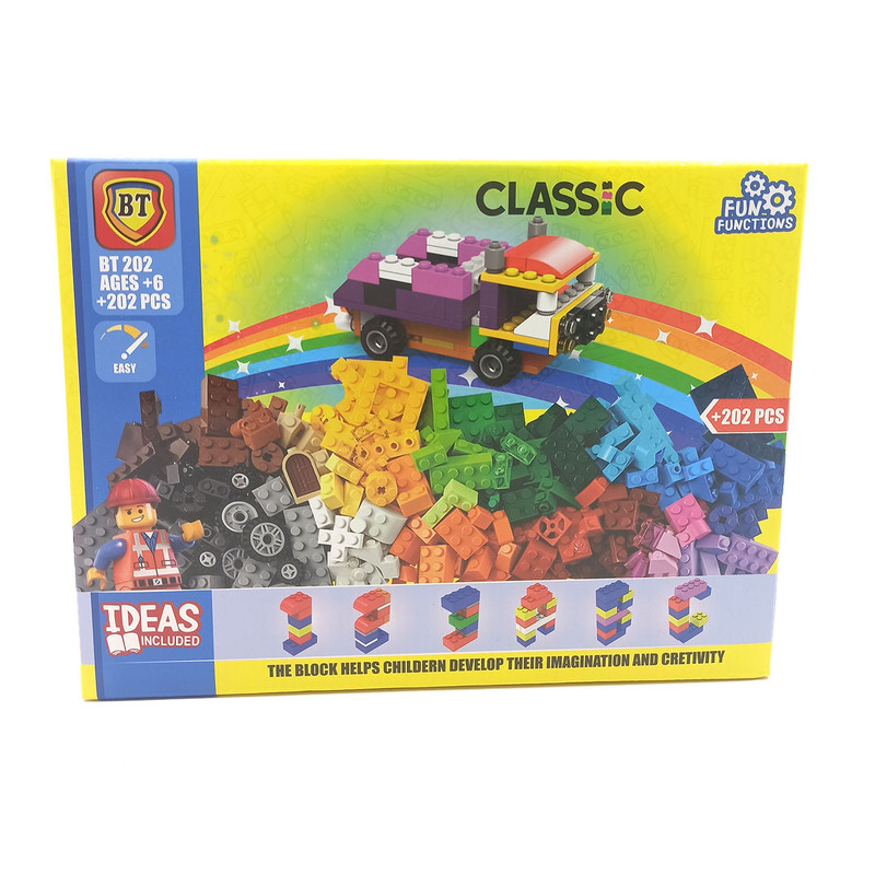 لگو کلاسیک BT از پلاستیک با کیفیت بالا ساخته شده است که آن را بادوام و ایمن برای کودکان میکند. شامل 202 قطعه رنگارنگ لگو میباشد که به کودکان اجازه ساخت هرنوع وسیله ای را میدهد.
