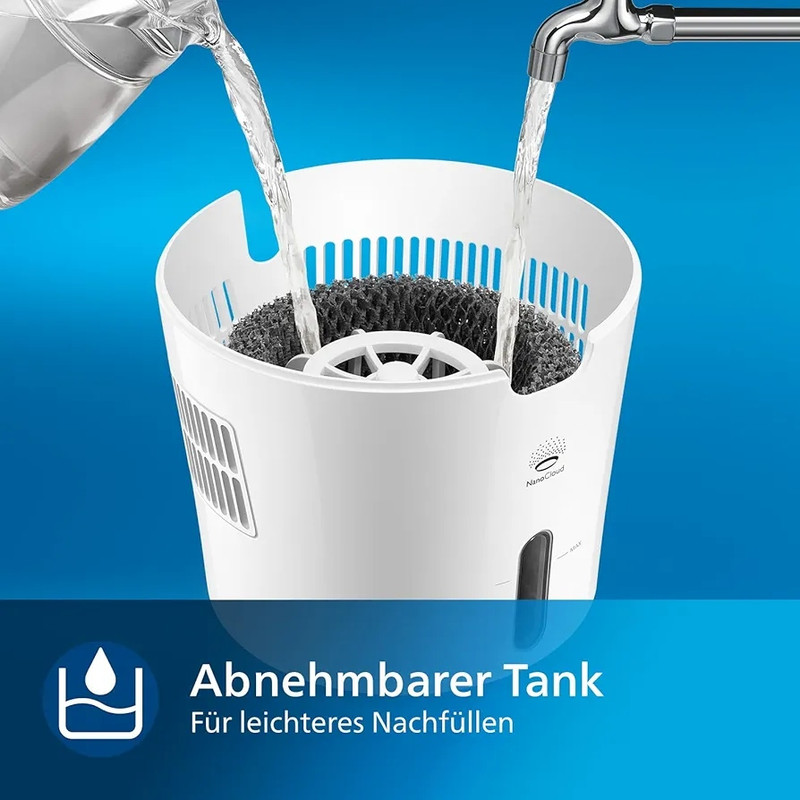 خانه خود را با هوای راحت و تمیز پر کنید. فناوری NanoCloud بدون گرد و غبار سفید یا لکه های مرطوب و تا 99 درصد کمتر باکتری ها را مرطوب می کند. رطوبت به طور مساوی توزیع می شود تا کل اتاق شما را به طور موثر مرطوب کند.یک دیفیوزر 360 درجه هوای مرطوب را به طور مساوی در کل اتاق پخش می کند. بخار بسیار ریز NanoCloud بیشتر میبرد و از اشباع بیش از حد برای مرطوبسازی مؤثر، بهویژه در اتاقهای بزرگتر جلوگیری میکند.فناوری منحصر به فرد NanoCloud از تبخیر طبیعی برای انتشار بخار آب خالص استفاده می کند. غبار بسیار ریز NanoCloud برای چشم نامرئی است و برای باکتری ها یا بقایای چسبیده به آن بسیار دشوار است – رطوبت هوا را با 99 درصد کمتر باکتری آزاد شده نسبت به مرطوب کننده های اولتراسونیک استاندارد.غبار نامرئی NanoCloud گرد و غبار سفید را آزاد نمی کند یا لکه های مرطوب در اتاق شما باقی نمی گذارد. قطرات بزرگتر ساطع شده توسط مرطوب کننده های اولتراسونیک ممکن است محیط اطراف را مرطوب کرده و مواد معدنی را حمل کنند که بقایای سفید روی سطوح مجاور باقی می ماند. ذرات NanoCloud برای حمل مواد معدنی بسیار کوچک هستند و به طور موثری از باقی مانده و لکه ها جلوگیری می کنند.