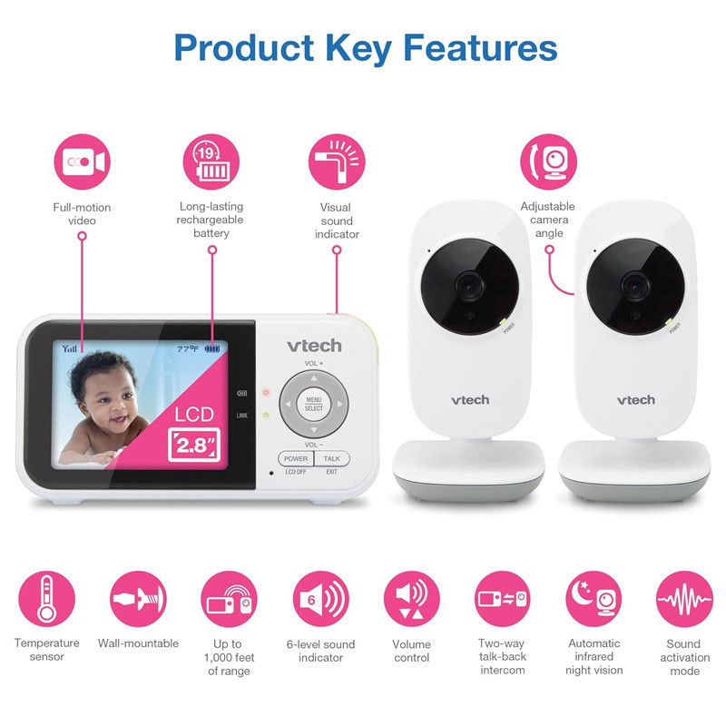 دوربین های کنترل وی تک با توجه به داشتن پنل مجزا، یک ابزار بسیار مهم برای آسایش مادر است. محصول VM 819 با 2 دوربین ،یک دوربین اتاق کودک با کیفیت بالا ولی اقتصادی است که بصورت 24 ساعته و بدون نیاز یه هیچ گونه اکانت یا پیچیدگی، وضعیت کودک را به مادر در پنل نشان داده و میتواند صدا را بصورت 2 طرفه منتقل نماید. پنل از یک صفحه 2.8 اینچی تشکیل شده و حداکثر تا 19 ساعت میتواند با یک شارژ در ارتباط با دوربین باشد.(طبق گفته کارخانه ، در عمل معمولا کمتر می باشد) . پخش انواع لالایی برای آرامش کودک ، نشان دهنده مستقل برای صدای اتاق کودک (رنگ سبز صدای کم ، رنگ قرمز گریه) ، قابلیت اکتیو شدن با صدا ، 300 متر برد ، دید در شب ، قابلیت اتصال به دیوار ،سنسور دما ، امنیت بالای ارتباط و غیر قابل هک ، .... از ویژگی های این محصول جمع و جور می باشد.