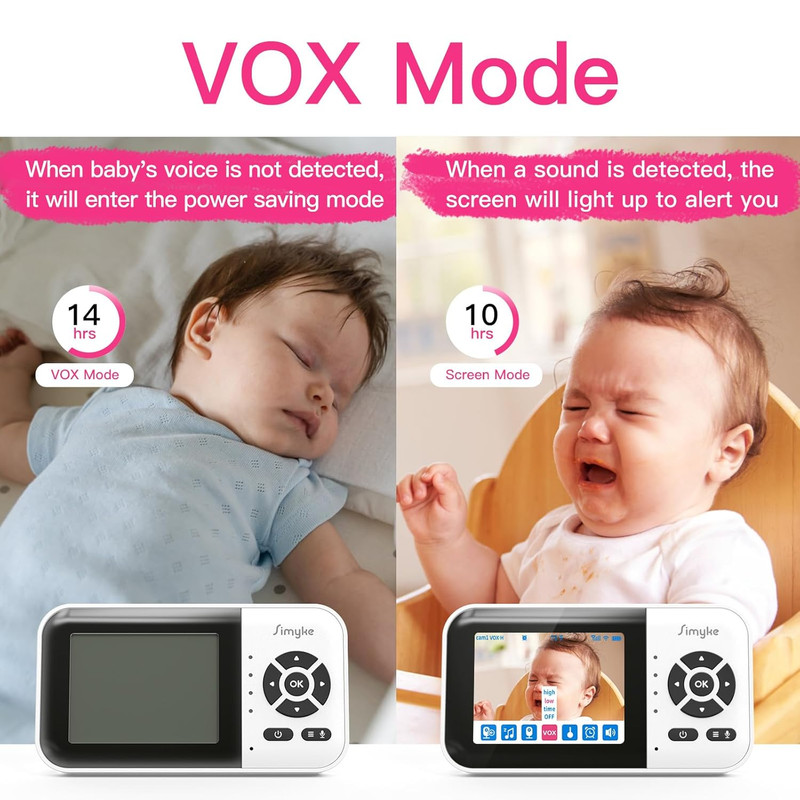 مانیتور کودک هوشمند با دوربین و صدا، حالت دوگانه، کلید روشن/خاموش وایفای، صفحه نمایش ۲.۸ اینچی، اپلیکیشن، دوربین ۱۰۸۰p، برد ۱۵۰۰ فوت، دید در شب، مکالمه دو طرفه، قابلیت آلبوم رشد کودک با هوش مصنوعی است