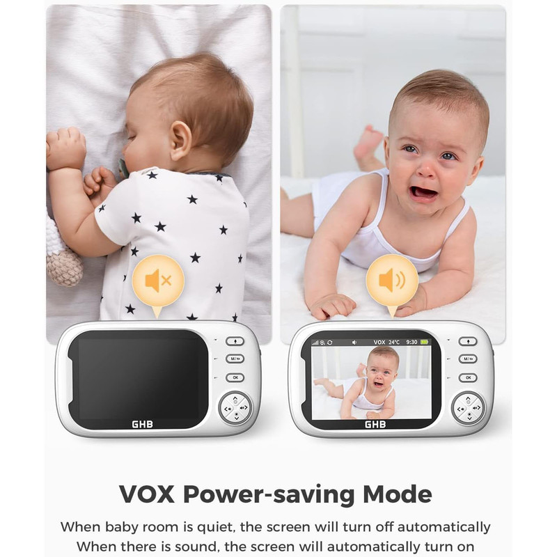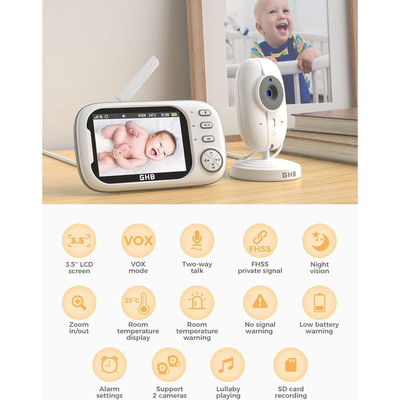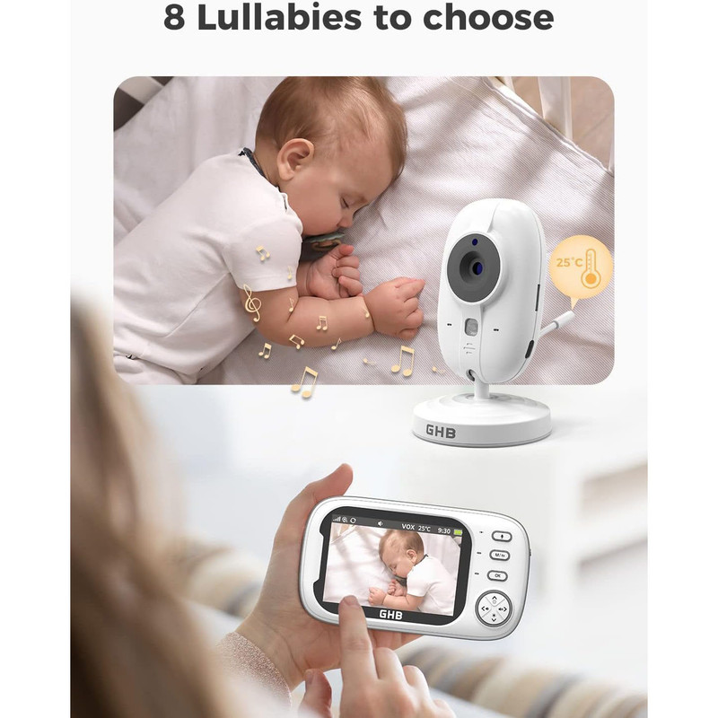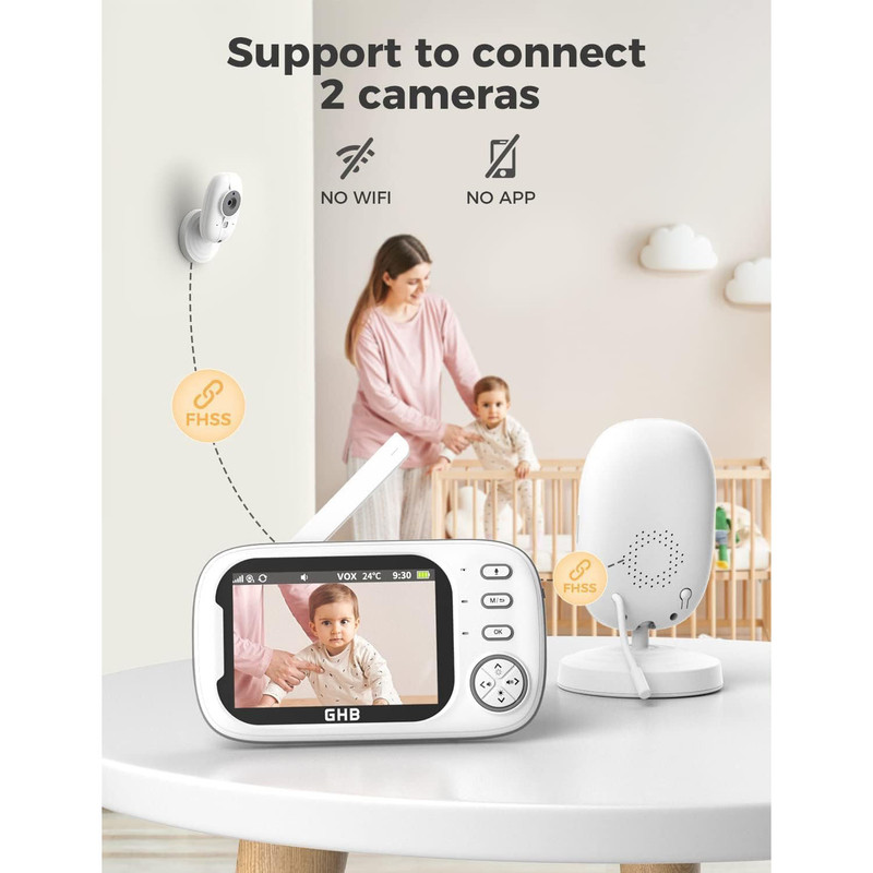 مانیتور کودک GHB با قابلیت دوربین دید در شب، دارای مانیتور ویدیویی ۳.۵ اینچی، حالت VOX، مکالمه دو طرفه، ۸ لالایی، هشدار دما، یادآوری تغذیه.اتصال امن و بدون نیاز به وایفای برای آرامش کامل خاطر: این مانیتور با اتصال خصوصی و رمزگذاریشدهی ۲.۴ گیگاهرتزی FHSS و بدون نیاز به وایفای یا برنامه، خطرات هک را از بین میبرد و یک لینک مطمئن و ایمن در سراسر خانه شما ایجاد میکند.