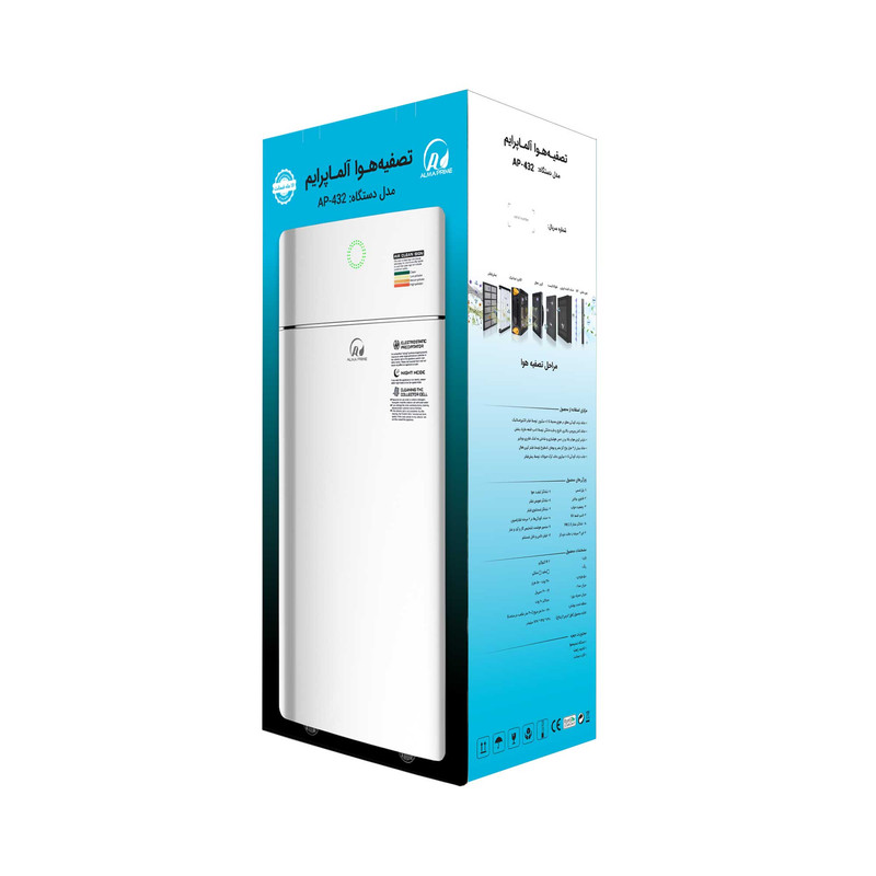 تصفیه هوای آلماپرایم مدل AP-432، مشابه تصفیه هوا آلماپرایم است با این تفاوت که این دستگاه از هر فیلتر (پیشفیلتر، الکترواستاتیک، کربن فعال، فتوکاتالیست و حذف کننده اوزون) دو سری دارد و برای متراژ تا 120 متر مربع مناسب است قابل استفاده برای منازل، ادارت، کلنیکها و مکانهای حساس مانند اتاق عمل، کلین روم و اتاق سرور است، دستگاه دارای نشانگر کیفیت هوا با سه رنگ سبز(هوای سالم) نارنجی(هوای به نسبت آلوده) و قرمز(هوای بسیار آلوده) است همچنین با پنل لمسی در بالای دستگاه، کنترل ویژگی های دستگاه مانند یون منفی، تایمر، لامپ UV و حالت خواب در دستان شماست.
