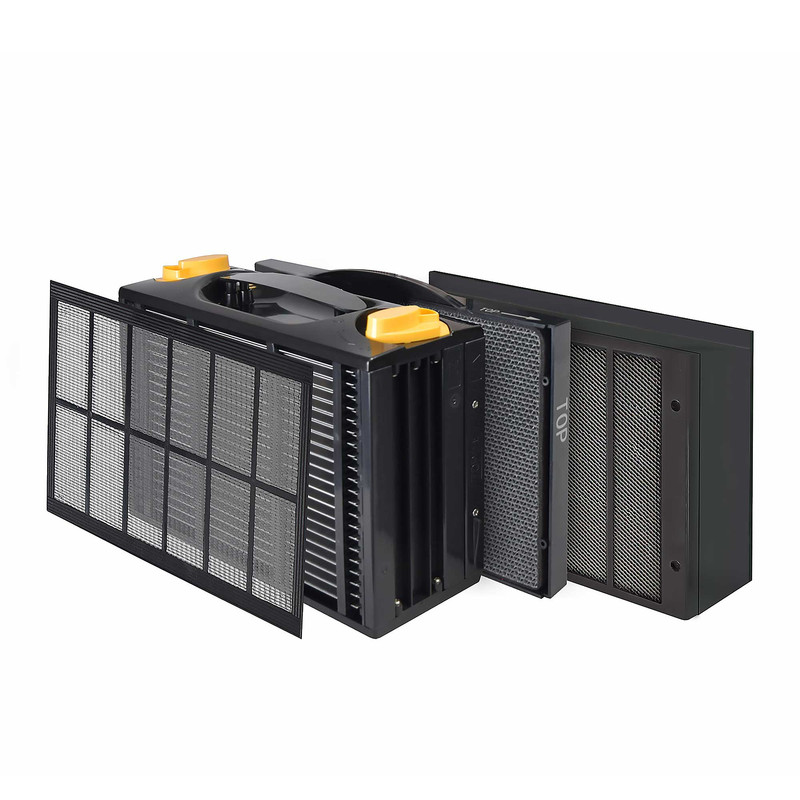 فیلترهای این دستگاه دائمی بوده و نیازی به تعویض ندارد: فیلتر اولیه که وظیفه جذب ذرات تا 10 میکرون و الکترواستاتیک تا 0.1 میکرون رو دارد را میتوانید بشویید و مجدد استفاده کنید؛ فیلتر کربن فعال که نقش حذف انواع بوهای نامطبوع، گازهای مضر و بخارات سمی و گازهای فرار مانند فرمالدهید رو دارد با فیلتر فتوکاتالیست در یک قاب قرار دارد و نیازی به تعویض و شستشو ندارند و تنها کافیست پس از اشباع فیلتر، آن را در معرض نور مستقیم خورشید به مدت 10 دقیق قرار دهید تا گازها و بوهای نامطبوع آزاد و مجدد فیلتر شما فعال گردد و قابل استفاده شود فیلتر فتوکاتالیست به همراه لامپ UV دستگاه غشاء بیرونی ویروس و باکتری های جذب شده را میشکند و از رشد و تکثیر آنها جلوگیری میکند؛ این دستگاه دارای سنسور هوشمند و حساس به ذرات گرد و غبار و بو میباشد که میتوانید حساسیت آن را در سه مرحله تغییر دهید و با باز کردن درب سنسور که در پشت دستگاه قرار دارد میتوانید با اسپری تمیز کننده سنسور آلماپرایم آن را تمیز کنید. با اینورتر موجود در دستگاه مصرف آن کم بوده و میتواند بی وقفه مراقب نفس های شما باشد.