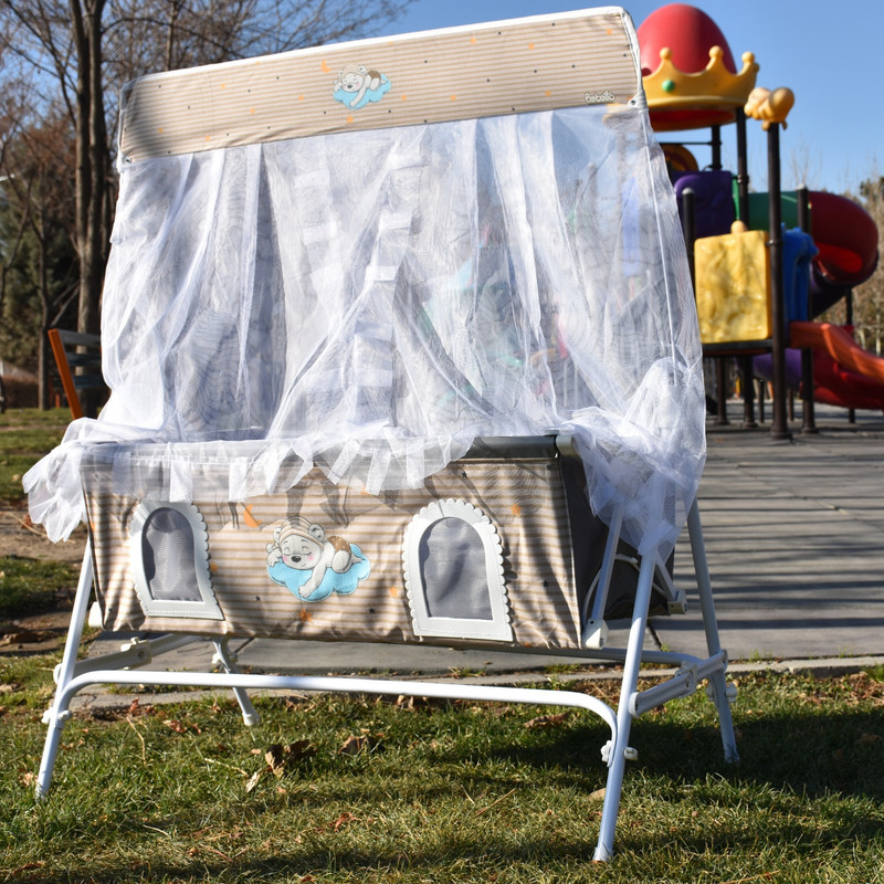 3. تور گهواره : گهواره دو تا تور داره، یکی تور پشه بند که روی سبد کشیده میشود و یکی هم تور صحرایی که توسط دو عدد مفتول که داخل پایه های گهوارست به صورت تاج روی گهواره نصب میشود