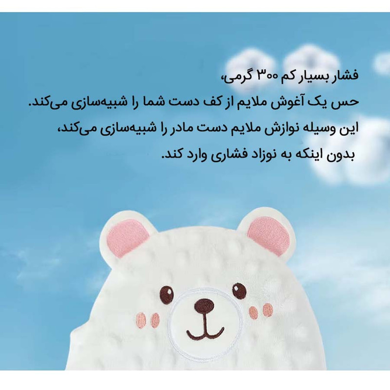 دست نوازشگر کودک مدل شارژی کنترلی، یکی از بهترین ابزارهای آرام بخش برای نوزادان و کودکان خردسال است که با طراحی خلاقانه و عملکردی هوشمند تجربه ای شبیه به نوازش واقعی والد را فراهم می کند. این محصول به شکل خرس بامزه پارچه ای طراحی شده و داخل آن از دانه های لوبیا و مواد نرم و ضد حساسیت پر شده تا هم برای پوست حساس نوزاد کاملاً ایمن باشد و هم فشار ملایمی را سبب شود.