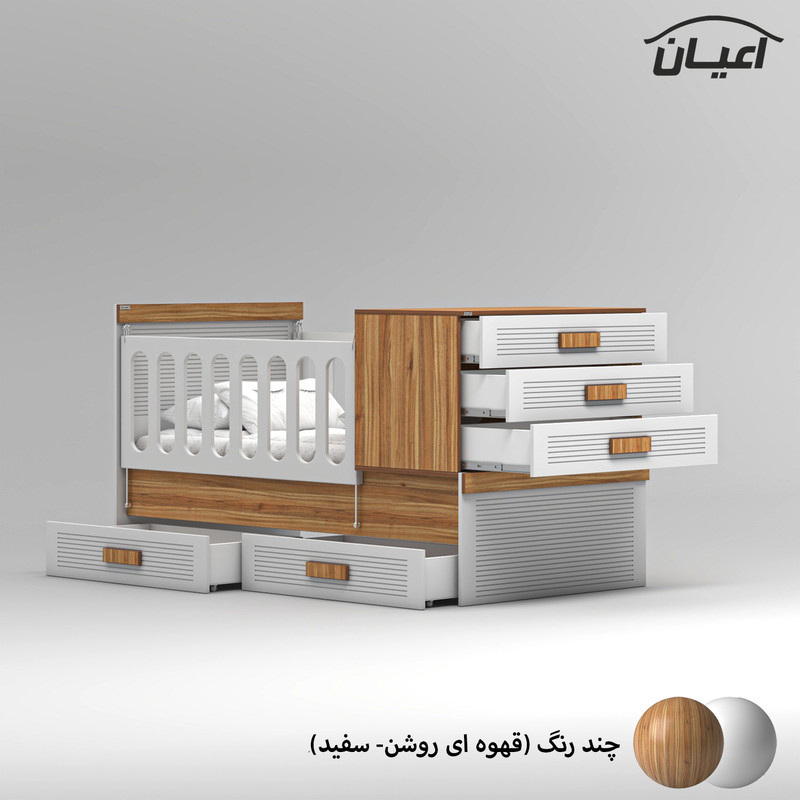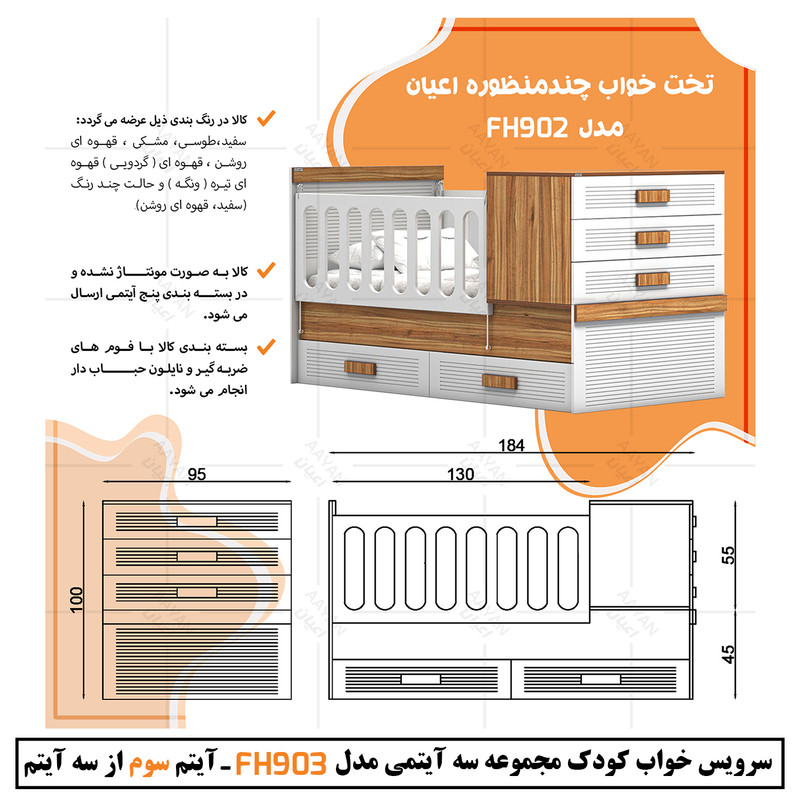 آیتم سوم : تخت خواب چند منظوره کودک و نوجوان اعیان ، جنس بدنه مغزی نئوپان با روکش ملامینه ، جنس درب کشوها و کلگی بالا و پایین : مغزی ام دی اف با روکش وکیوم ، دارای یک دراور سه کشو با بازشوی ریل سه تکه ساچمه ای و دو کشو با بازشوی چرخ چمدانی(ساکی)،حفاظ دو طرف کار به صورت آسانسوری (دو طرف متحرک) است ، کالا فاقد تشک بوده و سایز تشک مناسب کار 80×180سانت می باشد.