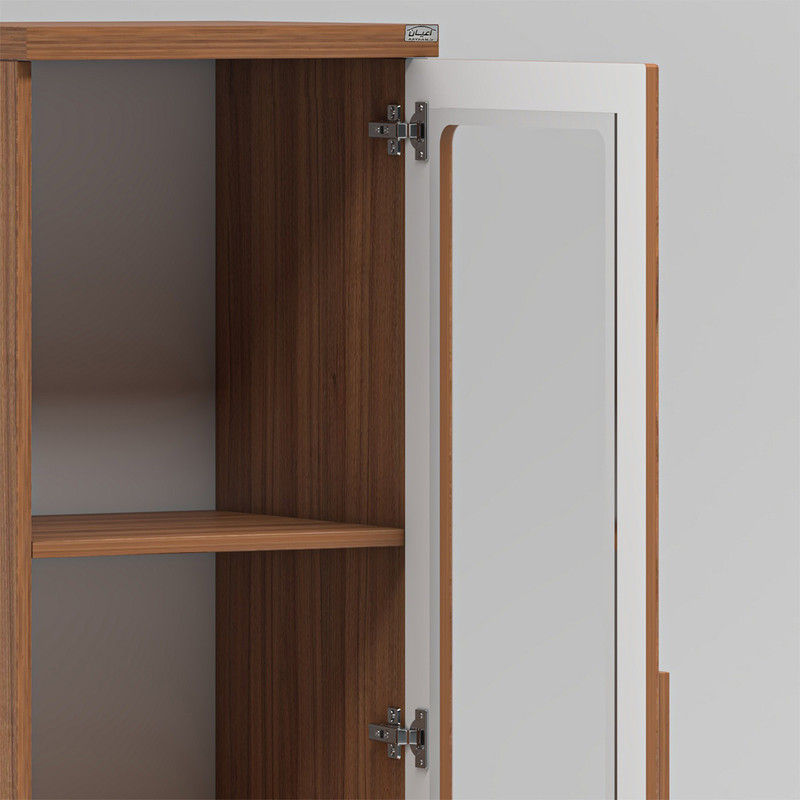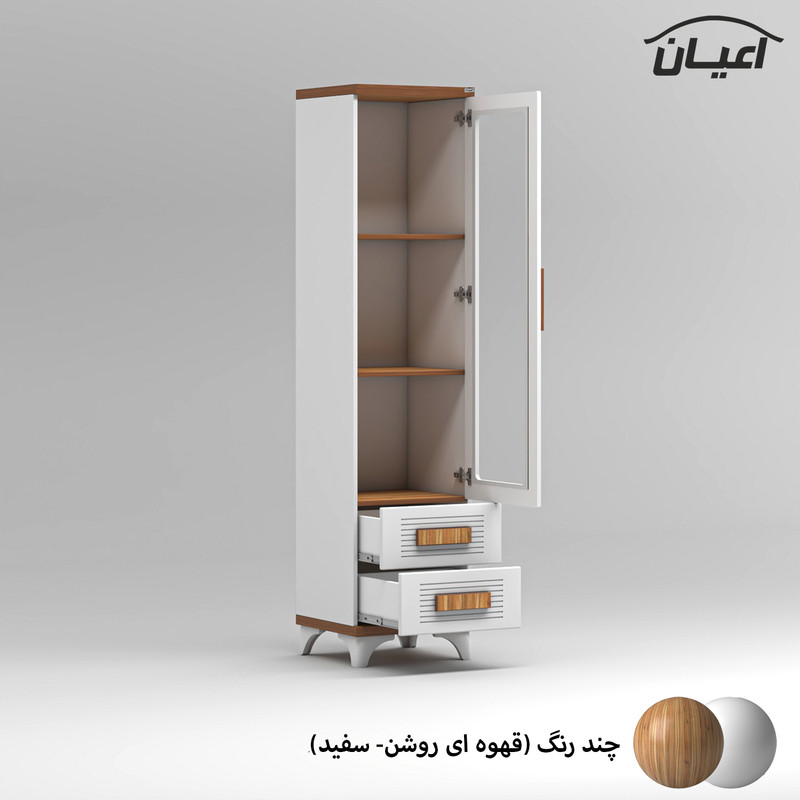 آیتم دوم : ویترین و کتابخانه کودک اعیان ، جنس بدنه مغزی نئوپان با روکش ملامینه و جنس درب ها مغزی ام دی اف با روکش وکیوم ، دارای یک درب کمدی ویترینی شیشه خور با بازشوی لولای آرام بند و دوطبقه و سه فضا برای قرار دادن اکسسوری و کتاب ، دارای دو کشو با بازشوی ریل سه تکه ساچمه ای.