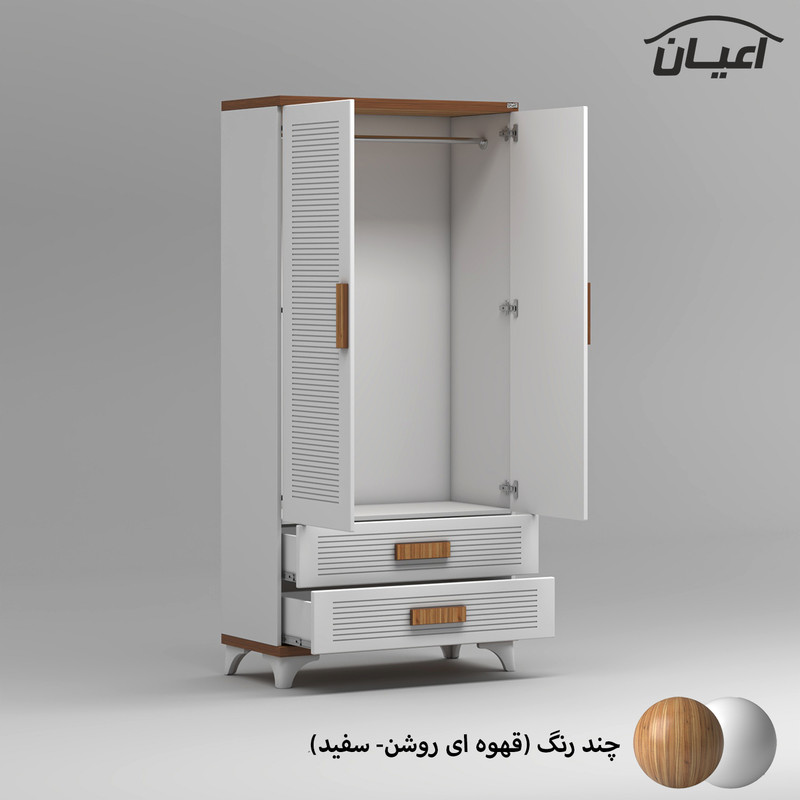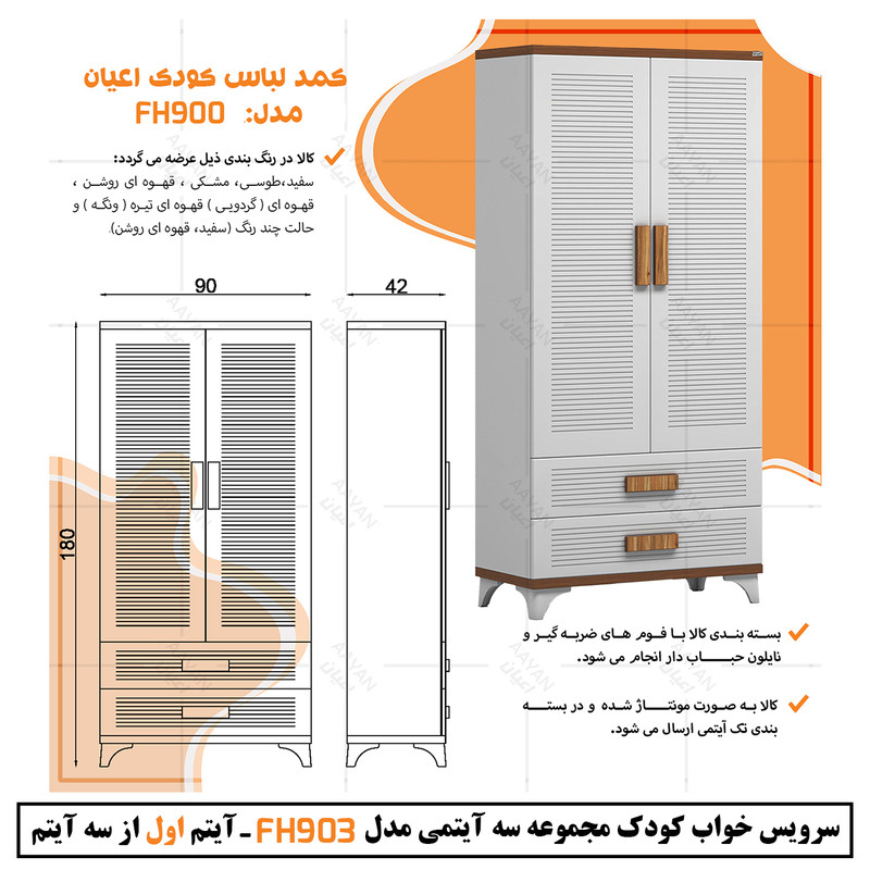 آیتم اول : کمد لباس کودک اعیان ، جنس بدنه مغزی نئوپان با روکش ملامینه و جنس درب ها مغزی ام دی اف با روکش وکیوم ، دارای دو درب کمدی با بازشوی لولای آرام بند ، دارای رگال لباس ، دارای دو کشو با بازشوی ریل سه تکه ساچمه ای.