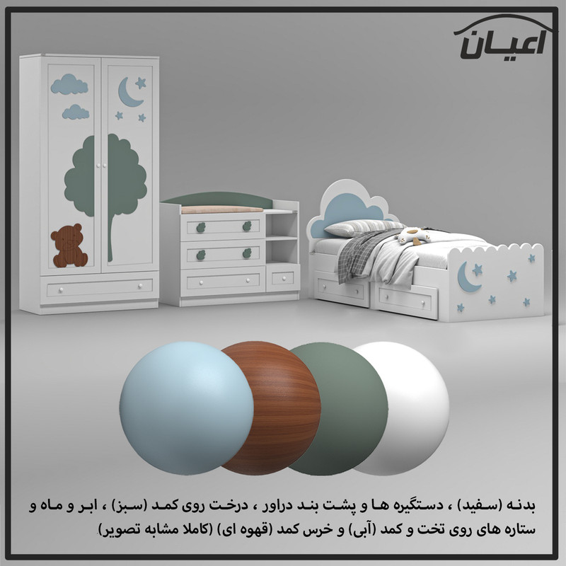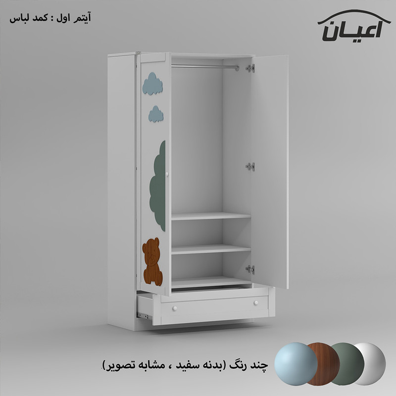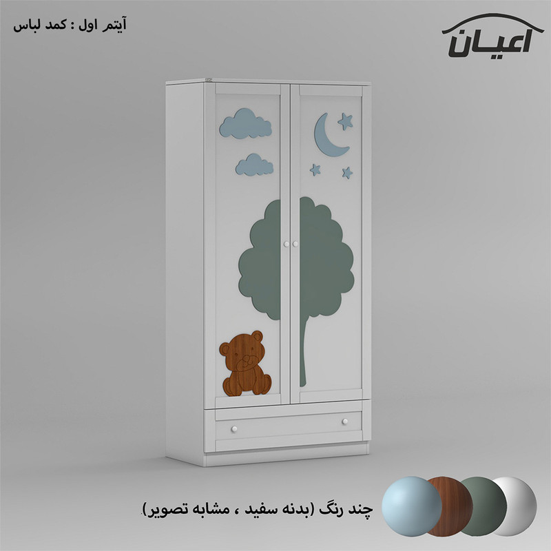 آیتم اول : کمد لباس کودک اعیان ، جنس بدنه مغزی نئوپان با روکش ملامینه و جنس درب کشوها و درب های کمدی مغزی MDF با روکش وکیوم و همچنین نمای روی درب ها مغزی سه میل با روکش وکیوم است ، دارای دو درب کمدی با طرح آسمان و جنگل ، دارای رگال لباس و دو طبقه متحرک برای روی پین طبقه (قابل برداشتن) و یک کشو ، دستگیره های این کالا از جنس PVC و به شکل توپی می باشد ، این آیتم تنها در حالت چند رنگ ( بدنه و درب ها : سفید ، درخت : سبز ، ماه ، ابر ها و ستاره ها : آبی و خرس : قهوه ای ) تولید و عرضه می گردد.