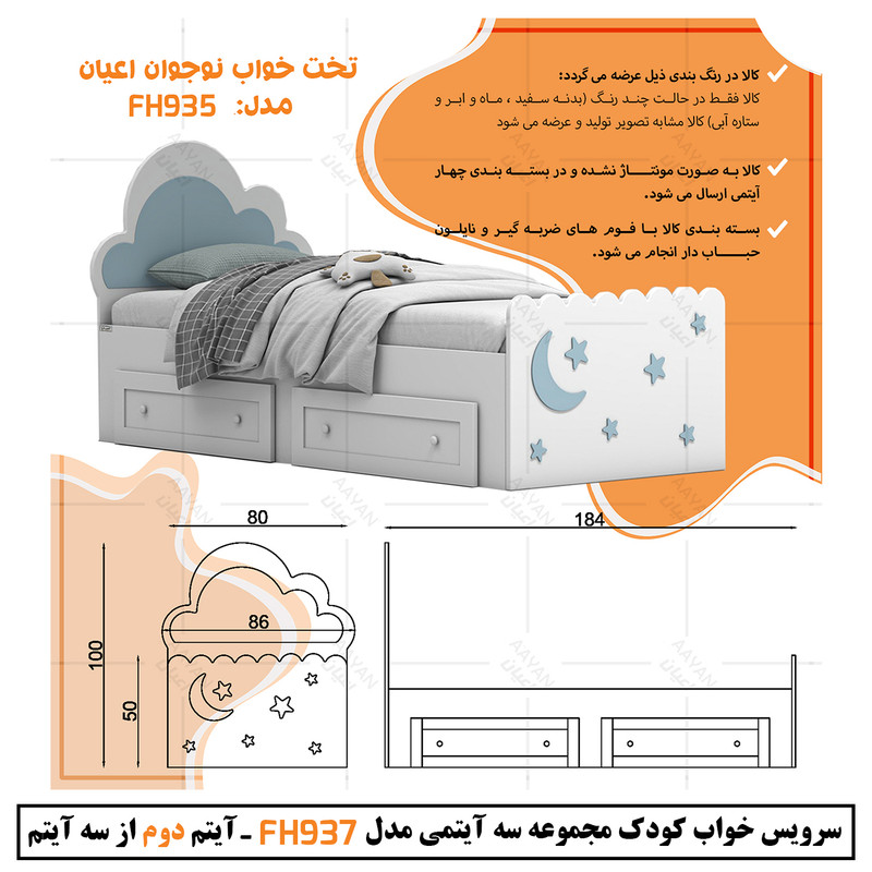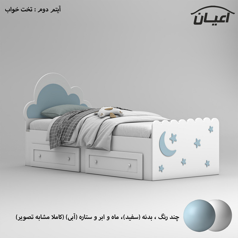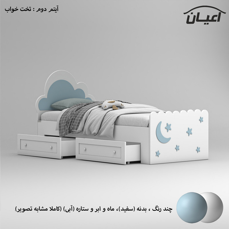 ایتم دوم : تخت خواب کودک و نوجوان اعیان ، جنس کلگی و درب کشو کالا ام دی اف با روکش وکیوم و جنس بغل تخت و کلاف داخلی کشوها نئوپان ملامینه ، طراحی ساده ، شیک و کودکانه (به شکل ابر) ، دارای دو کشو استاندارد با بازشوی چرخ چمدانی (چرخ ساکی) ، ارسال کالا به صورت مونتاژ نشده صورت می گیرد و نیاز به نصب دارد ، کالا فاقد تشک می باشد ، کفی نئوپان و به صورت دو تکه به همراه چند جفت پایه متحرک است ، سایز تشک مناسب برای تخت خواب(180×80 سانتی متر) است، این کالا فقط به صورت چند رنگ ( بدنه سفید و ماه و ابر و ستار ها آبی) تولید و عرضه می شود.