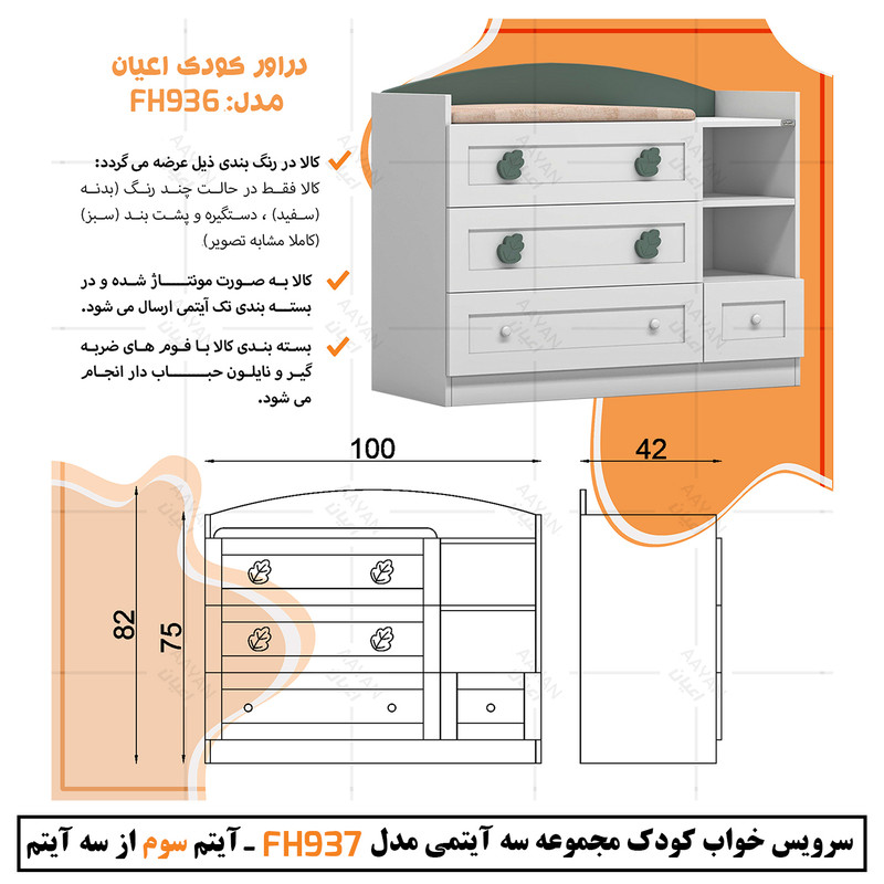 این کالا را فقط با لوگو و برند اعیان تهیه کنید، لطفا توجه داشته باشید که همواره چند درجه اختلاف رنگ بین تصاویر بارگذاری شده و کالای ساخته شده وجود دارد. برای تهیه کمد لباس کودک به تنهایی (آیتم اول) کد FH835 - تهیه تخت خواب به تنهایی (آیتم دوم) کد FH935 و تهیه دراور به تنهایی (آیتم سوم) کد FH936 را در پنل برند اعیان جست و جو و انتخاب کنید.