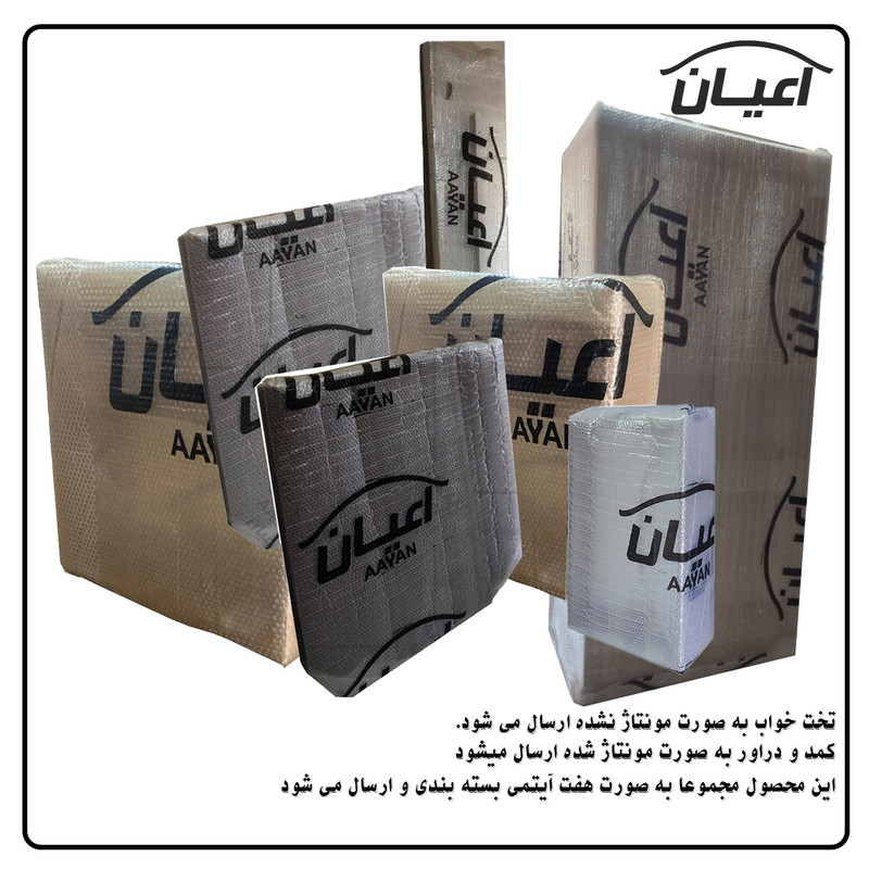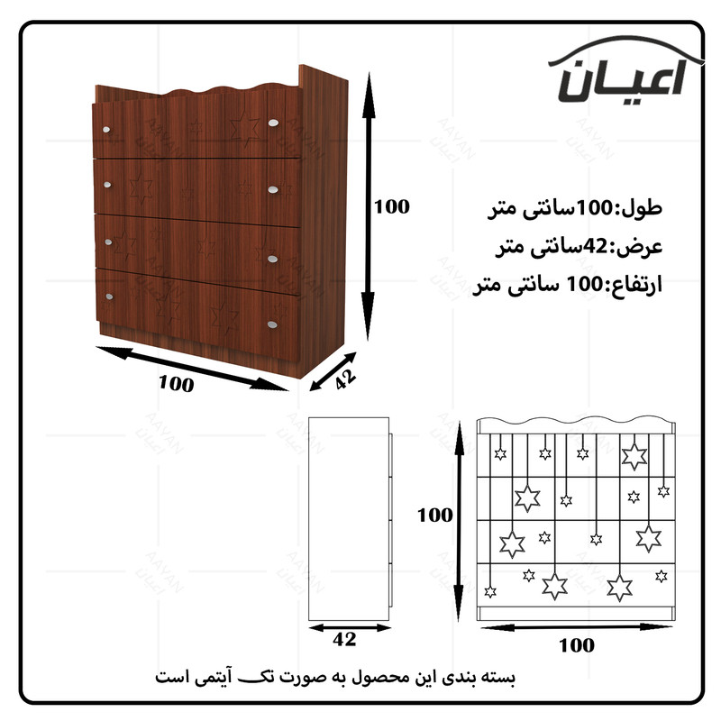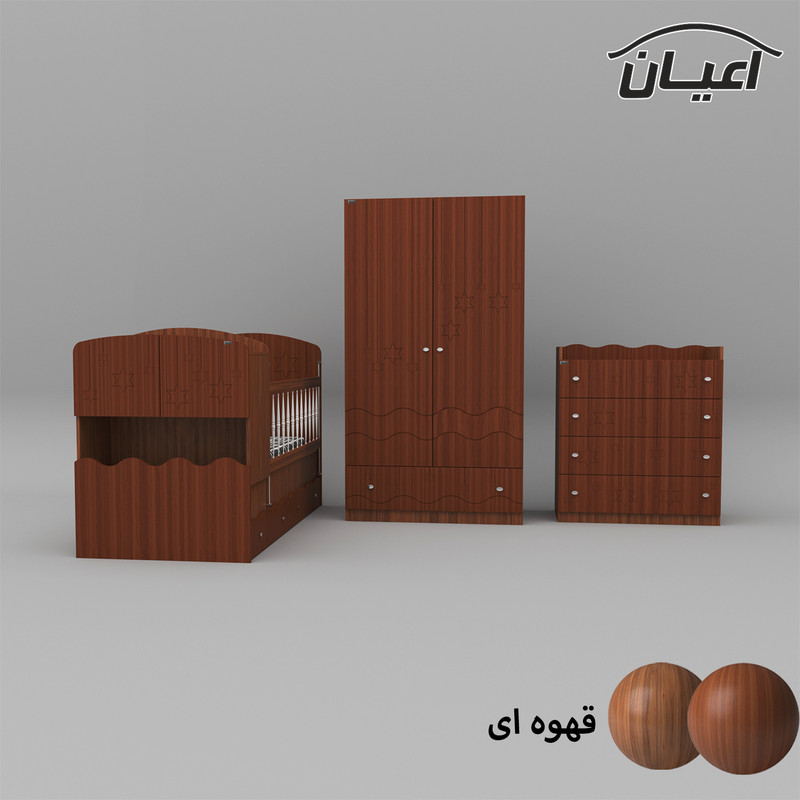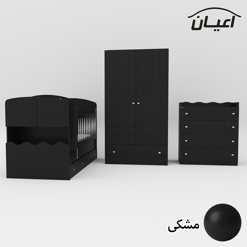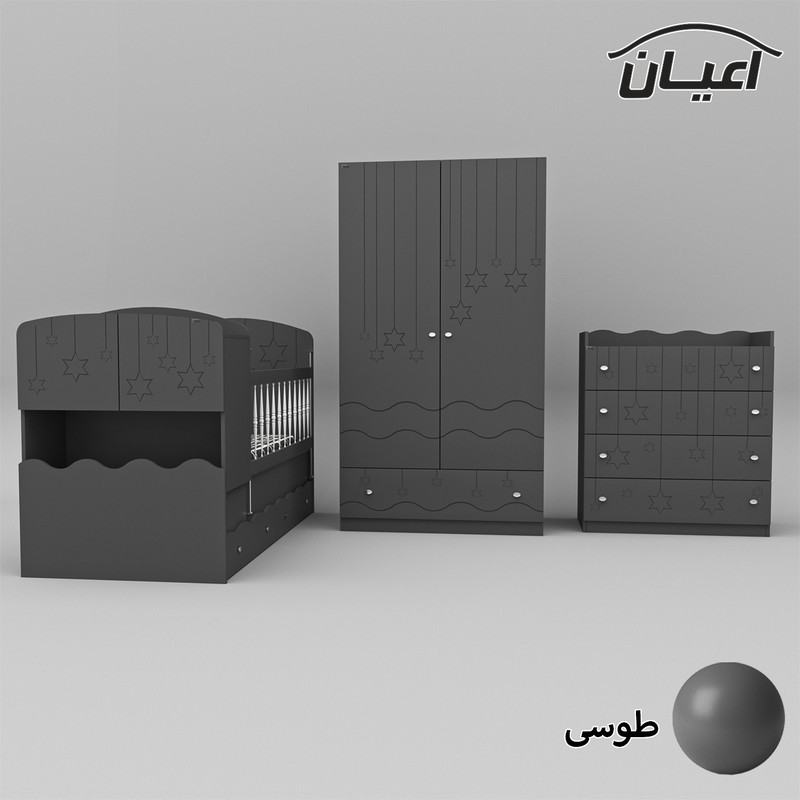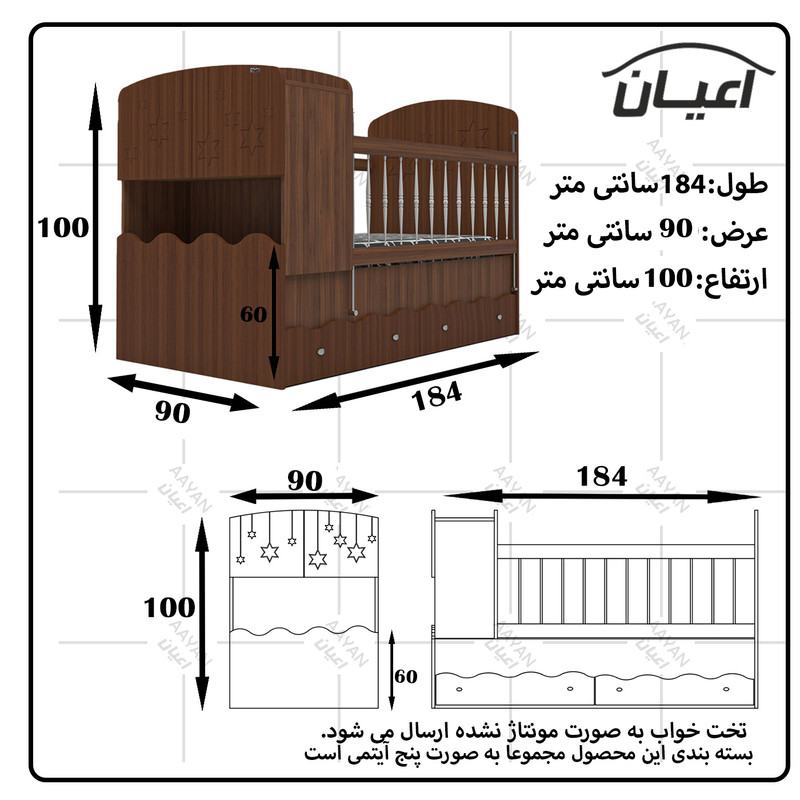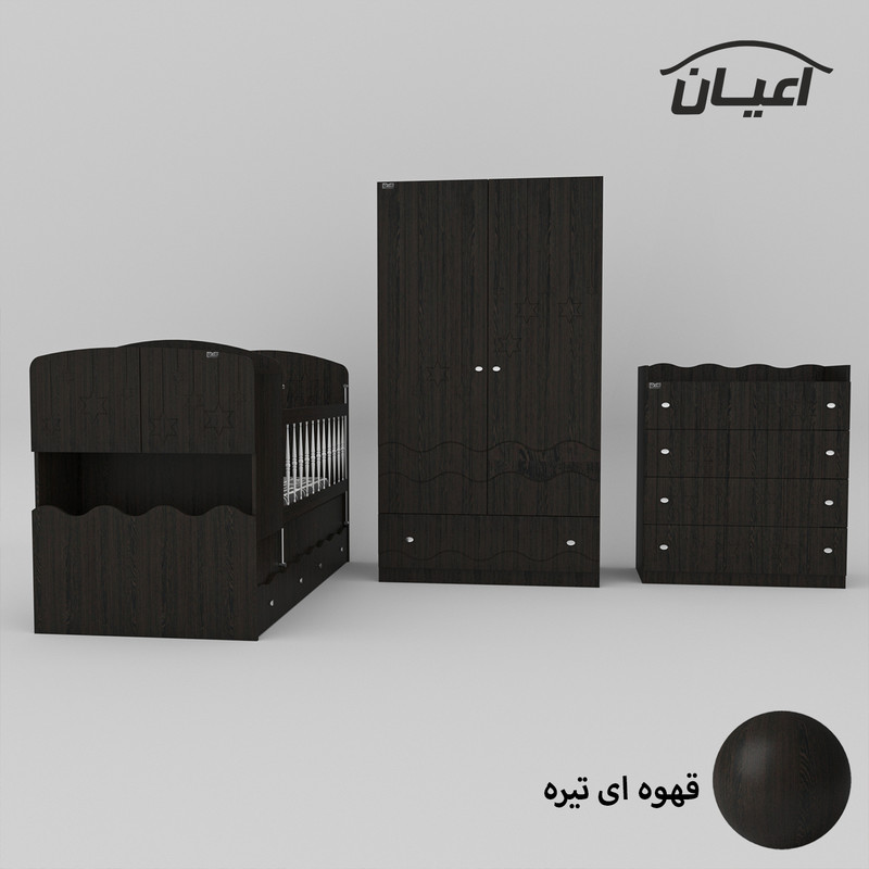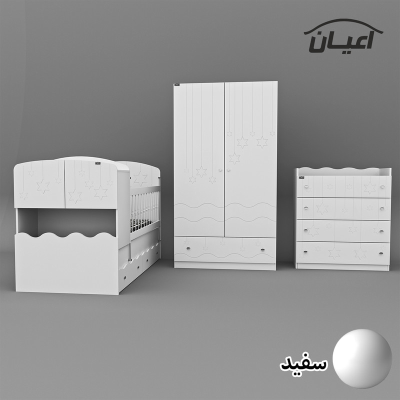 سرویس تخت خواب چند منظوره و کمد لباس و دراور کودک و نوجوان اعیان طرح ستاره.جنس نئوپان ملامینه و وکیوم(MDF با روکش PVC).سطح ضدخش.وزن متناسب با ابعاد.مناسب تشک80x180(کالا فاقد تشک می باشد).دارای دو کشو چرخدار.در قسمت کلگی پایین دارای دراور شامل دو درب کمدی.یک طبقه مجزا است.کفی تخت نئوپان است.کالا به صورت مونتاژ نشده ارسال می شود و نیاز به نصب دارد.نرده های حفاظ پی وی سی می باشد.حفاظ یک سمت ثابت و سمت دیگر متحرک( آسانسوری) است.کمد لباس دارای دو درب کمدی شامل میله رگال و دو طبقه.دارای یک کشو با ریل ساچمه ای.دراور اعیان شامل چهار کشو با ریل ساچمه ای.کالا دارای تاج می باشد.روی درب های کالاها طرح ستاره حک شده است.در رنگ های متنوع.بسته بندی با لوگو و برند اعیان.