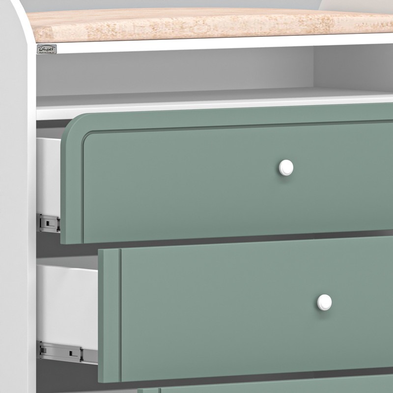 آیتم اول : دراور کودک اعیان ، جنس بدنه : مغزی نئوپان با روکش ملامینه ، جنس درب های کشو : مغزی ام دی اف با روکش وکیوم ، دارای سه کشو با بازشوی ریل سه تکه ساچمه ای ، دارای یک طبقه به ارتفاع تقریبی 10 سانتی متر جهت قرار دادن لوازم روزمره (کفش و پاپوش ها ، لباس ها ، پوشک و....) ، روی کار دارای یک لمسه کرمی رنگ از جنس مخمل جهت (تعویض پوشک کودک) می باشد.