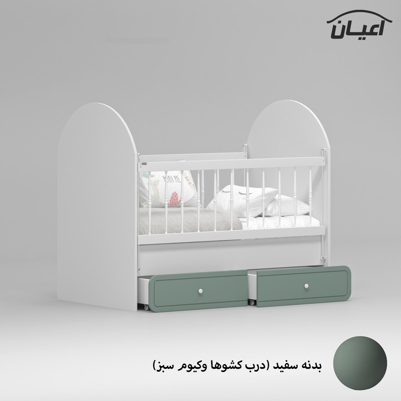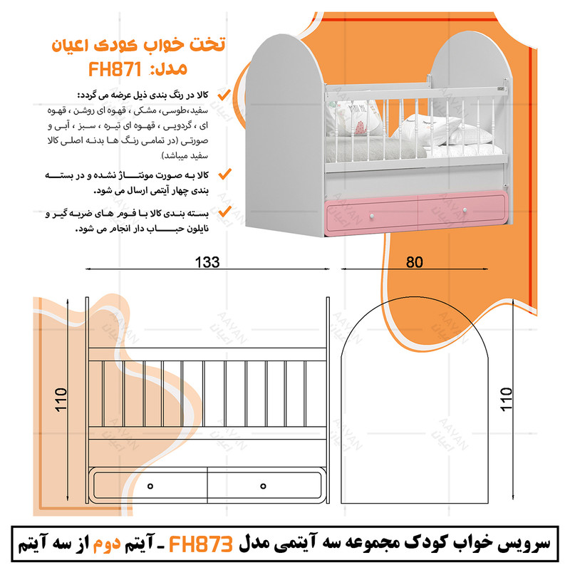 آیتم دوم : تخت خواب کودک اعیان ، جنس بدنه : مغزی نئوپان با روکش ملامینه ، جنس درب کشو ها مغزی ام دی اف با روکش وکیوم ، دارای دو کشو با چرخ چمدانی (ساکی) که با توجه به چیدمان اتاق کودکتان میتوانید از هر دو طرف تخت از آنها استفاده کنید ، حفاظ دو طرف کار به صورت آسانسوری و نرده ها به صورت خراطی و از جنس pvc است ، کالا فاقد تشک بوده و سایز تشک مناسب کار 70×130 می باشد.