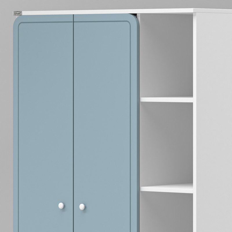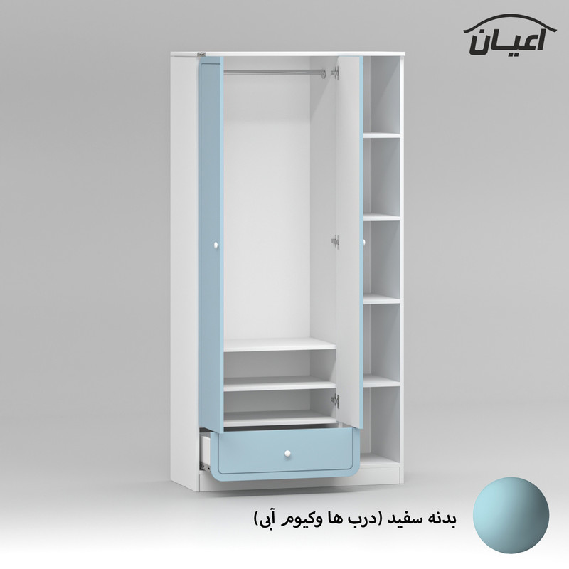 آیتم سوم : کمد لباس کودک و نوجوان اعیان ، جنس بدنه : مغزی نئوپان با روکش ملامینه ، جنس درب ها مغزی ام دی اف با روکش وکیوم ، دارای چهار طبقه و پنج فضا در قسمت سمت راست کمد، جهت استفاده به عنوان کتابخانه ، دارای دو درب کمدی با طراحی CNC ، فضای داخلی دارای میله رگال و دو طبقه جهت قرار دادن لباس و اکسسوری ، دارای یک کشو با باز شوی ریل سه تکه ساچمه ای.
