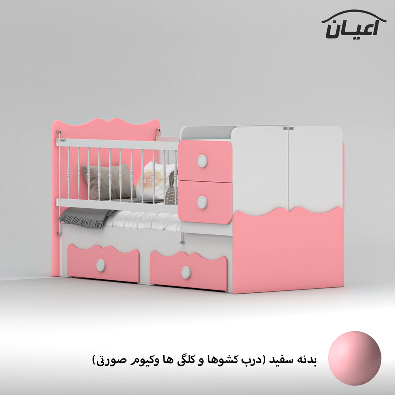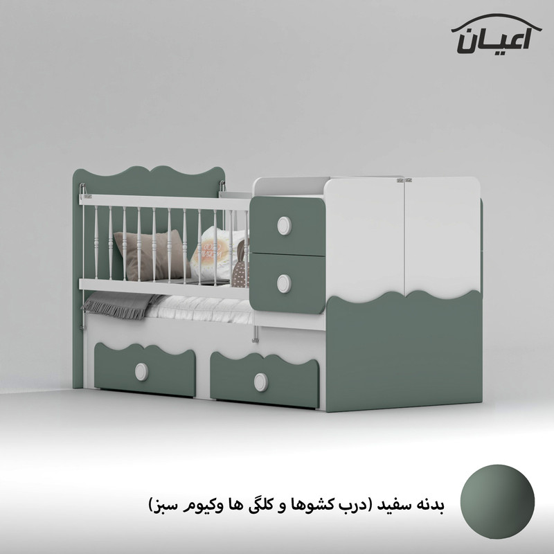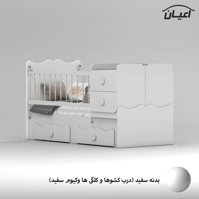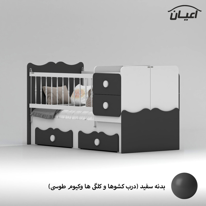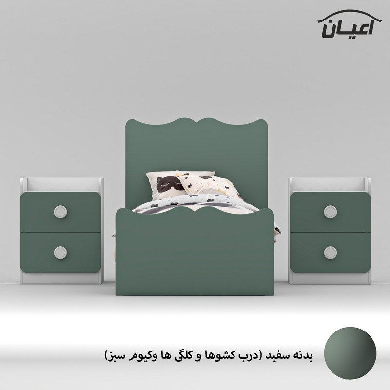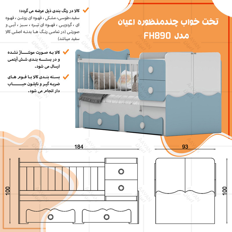 تخت خواب چند منظوره کودک و نوجوان اعیان ، جنس بدنه مغزی نئوپان با روکش ملامینه ، جنس درب کشو ها و کلگی بالا و پایین : مغزی ام دی اف با روکش وکیوم ، دارای دو پاتختی با چهار کشو با بازشوی ریل سه تکه و دو کشو با بازشوی چرخ چمدانی(ساکی)،حفاظ دو طرف کار به صورت آسانسوری و نرده ها به صورت خراطی و از جنس pvc است (دو طرف متحرک) ، کالا فاقد تشک بوده و سایز تشک مناسب کار 80×180سانت می باشد. این کالا در رنگ بندی (سفید ، طوسی ، مشکی ، قهوه ای روشن ، قهوه ای (گردویی) ، قهوه ای تیره (ونگه) ، آبی ، صورتی و سبز) تولید و عرضه می گردد ، دقت کنید که در تمامی رنگ ها بدنه ی اصلی کالا سفید می باشد و معیار انتخاب رنگ ، رنگ درب کشوها و کلگی ها می باشد، توجه فرمایید که همواره چند درجه اختلاف رنگ بین تصاویر بارگزاری شده و کالای ساخته شده وجود دارد. برای انتخاب کمد لباس ست همین تخت خواب کد FH891 و برای انتخاب دراور ست همین تخت خواب کد FH892 را جست و جو و انتخاب کنید