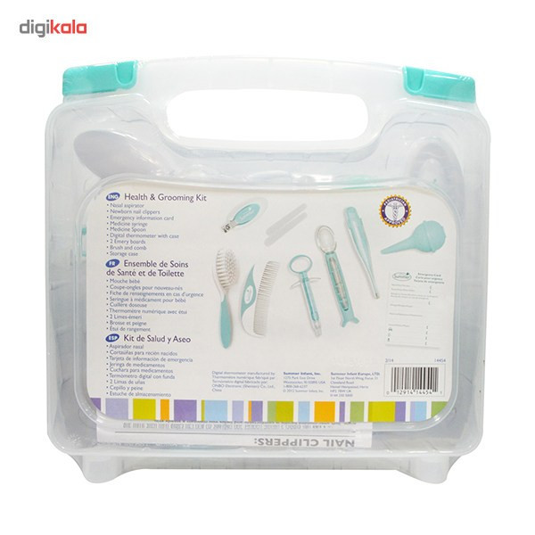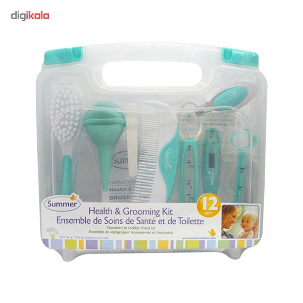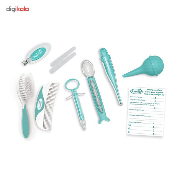 معمولا قرار داشتن تمامی لوازم بهداشتی کودک در کنار هم و در یک مجموعه، علاوه بر همرنگ بودن و از یک برند بودن، مقرونبهصرفه خواهد بود. همچنین داشتن یک کیف برای تمامی این وسایل ریز باعث میشود تا از گمشدن آنها جلوگیری شود. ست بهداشتی برند «سامر» یک مجموعه کامل از تمام وسایلی است که از بدو تولد نوزاد مورد نیاز شما میشود. این ست 12 تکه، شامل ضروریترین و پرکاربردترین لوازم اولیه است. این ست شامل شانه و برس بوده که برس آن دارای الیاف نرم است. همچنین شانه آن دارای دندانههای گرد و منظم است. پوآربینی از دیگر لوازمی است که در این کیف قرار دارد. برای پاک کردن بینی نوزاد و جلوگیری از گرفتگی آن، بهتر است روزی یکبار از این وسیله استفاده کنید. پوآربینی این برند، جنس پلاستیکی مرغوبی داشته و کاملا انعطافپذیر است. ناخنگیر با سری فلزی، سوهان ناخن و دندانگیر از دیگر وسایلی هستند که در این مجموعه قرار دارند. همچنین برای خوراندن داروهای تلخ مانند قطره آهن و غیرتلخ، دو نوع داروخوری متفاوت در این کیف قرار داده شده است. برای داروهای تلخ از داروخوری سرنگی و برای داروهای غیرتلخ از داروخوری قاشقی میتوانید استفاده کنید. از دیگر لوازمی که که در این مجموعه قرار داده شده و بسیار مورد استفاده قرار میگیرد، تبسنج است.