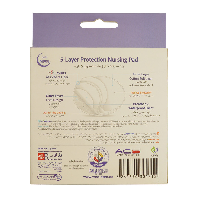 ترشح شیر و ایجاد لکه بر روی لباس از اتفاقاتی است که تمام مادران را گله مند می کند، ضرورت خرید و داشتن یک پد سینه مناسب به قدری زیاد است که سهل انگاری در خرید نمونه مناسب آن می تواند باعث بروز مشکلات جدی برای مادر و کودک گردد. پد سینه قابل شستشو وی کر با کیف حمل در بسته بندی 2 عددی در راستای رفع این مشکل می باشد. برخی مادران با استفاده از دستمال های غیر بهداشتی در لباس زیر خود، اقدام به جلوگیری از خیس شدن لباسشان می کنند؛ که این کار می تواند بسیار خطرناک و مشکل آفرین باشد و از آن جایی که آسیب نوک سینه موجب بر هم خوردن تغذیه نوزاد می گردد، پد سینه وی کر با داشتن روزنه گردش هوا، ضد حساسیت می باشد و هیچ گونه آسیبی به فرم نوک سینه وارد نکرده و از ایجاد اختلال در روند شیردهی جلوگیری می کند. پد سینه قابل شستشو وی کر بسیار نازک می باشند و هنگام قرار گرفتن زیر لباس غیرقابل رویت هستند. هم چنین این پدهای سینه وی کر، ساختاری منحنی شکل و سازگار با فرم سینه مادر دارند. پد سینه قابل شستشو وی کر از 5 لایه شامل یک سطح داخلی پنبه ای بسیار نرم و لطیف چسبیده به سینه مادر، دو لایه میانی جاذب با قدرت جذب بالا و یک لایه پشتی مقاوم در برابر نشت، به انضمام یک لایه بیرونی با طرح توری تشکیل شده است.