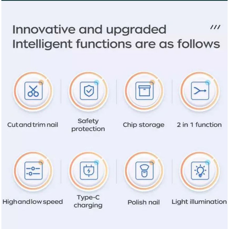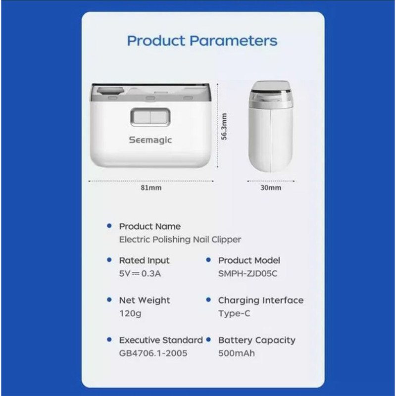 ناخن گیر اتوماتیک SEEMAGIC به شما کمک می کند تا بدون درد و یا آسیب به راحتی نظافت دستان خود و خانواده تان را حفظ کرده و ناخن هاییی زیباتر داشته باشید. خیلی از ما ممکن است که با گرفتن ناخن هایمانچن دچار مشکل شده باشیم. چراکه ناخن گیر های قدیمی اسیب بسیاری به صدف و حتی پوست دست ما می رسانند. اما با ناخن گیر اتوماتیک SEEMAGIC نه تنها این مشکل بلکه گرفتن ناخن فرزندانمان راحت تر شده است. دهانه منحنی طراحی شده در این ناخن گیر بهتر به نوک انگشتان می خورد، به طور موثر از آسیب تصادفی جلوگیری می کند. نور کمکی قسمت روی ناخن گیر پس از راه اندازی به طور خودکار به سر کاتر پاپ آپ اضافه می شود که دید را برای گرفتن ناخن ها بیشتر می کند. هنگامی که محصول در حال استفاده است، صدا در حدود 40 دسی بل است و صدای بیس مانند یک زمزمهی کوتاه می ماند. بدنه شیک و با کاربری آسان باعث می شود بچه ها عاشق کوتاه کردن ناخن شوند. طراحی ذخیره سازی پشتی اجازه می دهد تا ناخن های چیده شده در سطل زباله ناخن مکیده شوند تا از تمیزی و بهداشت اطمینان حاصل شود. این دستگاه دارای سوهان ناخن و پولیش برقی نیز میباشد.