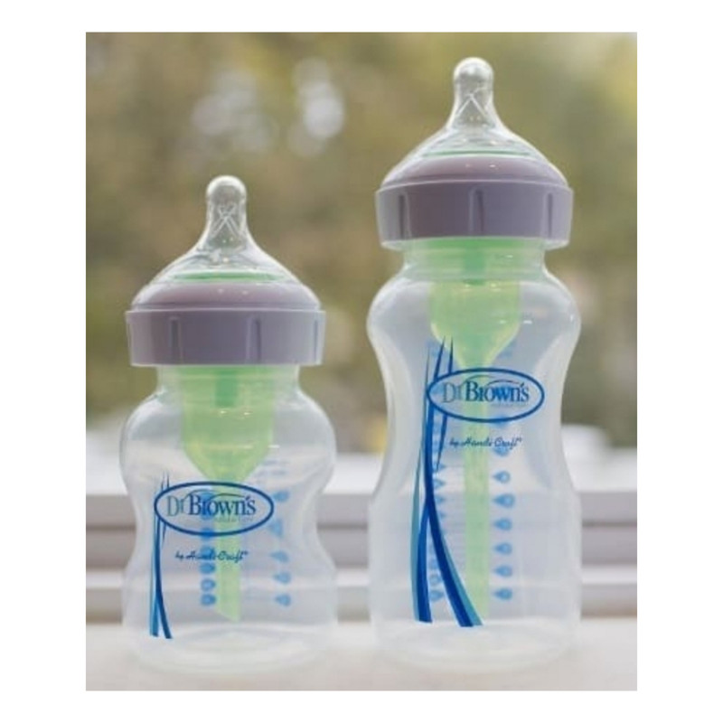 طراحی منحصر به فرد شیشه شیر آپشن پلاس دکتر براون از به وجود آمدن خلا و حباب هوا که در دیگر محصولات موجود وجود داشته جلوگیری می کند و هوا را به سمت جلو حرکت می دهد ، سپس هوا در سیستم مکش داخلی از شیر یا محتویات داخلی شیشه شیر جدا می شود و به بالای محفظه انتقال می یابد. بدین ترتیب شیردهی بسیار مناسب تر و راحت تر صورت می پذیرد و اثرات منفی حاصل از ایجاد خلا یا حباب هوا کاملا از بین رفته و به کاهش کولیک ، نفخ و بالا آوردن شیر و آروغ زدن کودک کمک می کند. شیر با محتویات غذایی به راحتی در مسیر سر شیشه جریان داشته و جریان هوا که در بالای محفظه شیشه ذخیره شده فشار مثبتی را جهت جلوگیری از چسبندگی سر شیشه ایجاد می کند در نتیجه مکیدن شیر به مراتب راحت تر بوده و از تجمع شیر در گوش نوزاد جلوگیری می کند (کاهش گوش درد نوزادان). شیشهشیرهای برند «دکتربراونز» از پلیپروپلین ساخته شده و سری سیلیکونی گرد دارند. طراحی گرد این سرشیشهها به این منظور صورت گرفته تا نوزاد هیچگونه تفاوتی بین آن و سینه مادر احساس نکند. جنس بدنه این شیشهها بهگونهای است که مواد مغذی شیر مانند ویتامین های A,E,C را تا 20 دقیقه در خود حفظ میکنند و مانع از جذب این ویتامینها و مواد مفید به بدنه شیشه میشوند. این شیشهها یک تفاوت عمده با سایر شیشهها دارند. در هر یک از این شیشهها یک لوله آنتیکولیک قرار داده شده است که از نفخ و کولیک معده جلوگیری میکند، با وجود این لوله احتمال هرگونه دل درد و نفخ در نوزاد به حداقل میرسد. نکته قابل توجه در این شیشهها تغذیه طولانیتر نوزاد است. تمامی محصولات برند «دکتر براونز» از جمله این شیشهشیرها فاقد ماده مضر BPA هستند. مجموعه دوتایی این شیشهشیرها در کنار مقرون به صرفه بودن آن، به شما این امکان را میدهد تا یکی از آنها را برای داخل خانه و یکی را برای بیرون و مهمانی استفاده کنید. شیشهشیر برند «دکتربراونز» کیفیت فوقالعاده بالایی داشته و مطابق با استانداردهای اروپا ساخته شده است. «دکتربراونز» یکی از برترین برندهای محصولات نوزاد در جهان شناخته شده است.