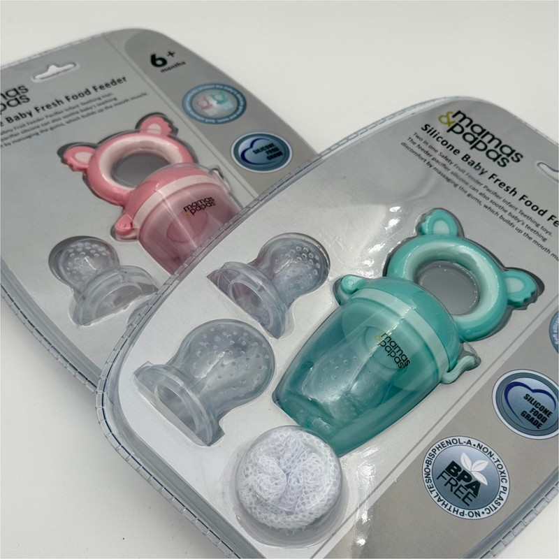 پک پستانک میوه خوری محصول برند ماماس پاپاس Mamas Papas تولید کشور چین می باشد. سری فيدينگ غذاخوری از جنس سیلیكونی و بسيار نرم و کاملا مناسب برای دهان و لثه كودک می باشد. این پستانک میوه خوری را می توان با انواع میوههای تکه تکه شده و سبزیجات پر کرد و درب آن را بست. سپس آن را به کودک داد تا با مکیدن، تمام عصاره موجود در میوه یا سبزیجات را به راحتی میل کند. پك پستانك تغذيه فيدينگ شامل یک سری سیلیکونی و دو عدد سری اضافی و یک توری است. این پستانك میوه خوری، موجب می شود تا کودک بتواند با لذت و به راحتی آبمیوه اش را به صورت کاملا طبیعی بخورد و پدر و مادر نیز ترس و نگرانی بابت بلعیدن و گیر کردن تکههای میوه در گلوی کودک نداشته باشند. پک پستانک میوه خوری ماماس پاپاس Mamas Papas کیفیت ساخت بالایی دارد و وسیلهای ایمن است که باعث تشویق و ترغیب کودک به خوردن غذاهای متنوع بجز شیر مادر میشود. مکیدن میوه خوری در تقویت لثه نوزاد و رویش بهتر دندان های کودک کمک کننده خواهد بود. پستانک دارای درب محافظ پلاستيكی برای جلوگیری از آلوده شدن سری است.