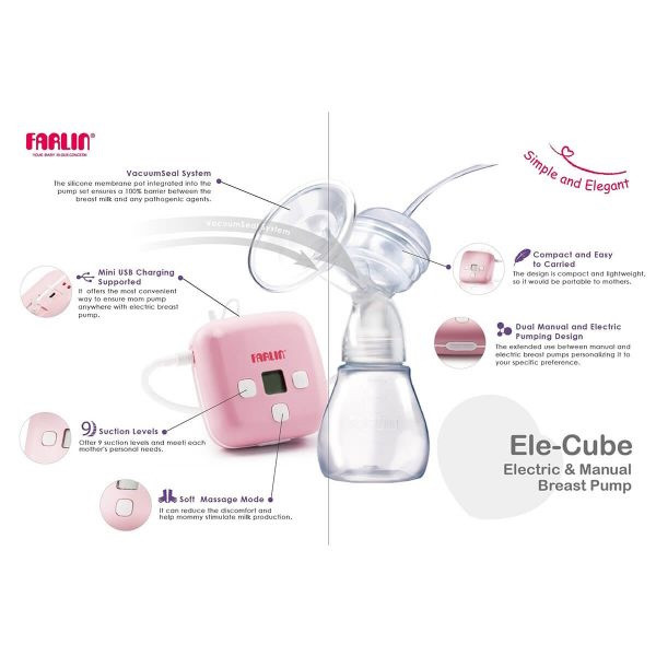 شیر دوش برقی دو حالته فارلین کد AA-12002 قابل استفاده به صورت دستی و برقی می باشد, این شیر دوش دارای حالت ماساژ با فشار 160MGH برای دوشیدن آسان تر شیر می باشد. داری 9 سطح مکش مختلف به همراه سری تمام سیلیکون . دارای نشانگر LED سطح مکش به همراه 4 ظرف مخصوص نگه داری شیر مادر بهمراه سر شیشه به همراه پد سینه و کابل شارژ, قابل استفاده با برق.