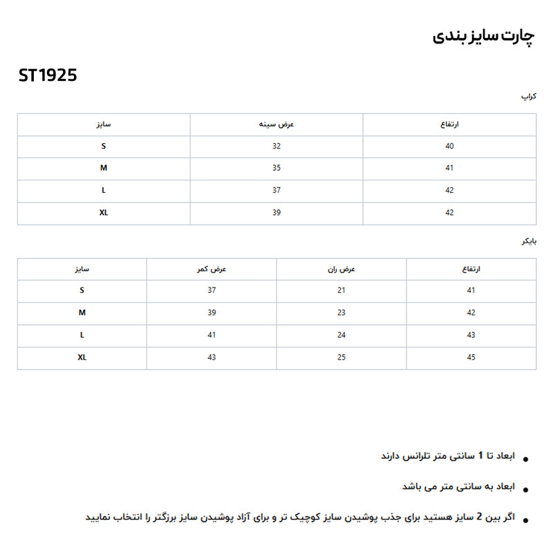 • سایزبندی: از سایز S تا XL موجود است، که مناسب برای انواع اندامها میباشد.