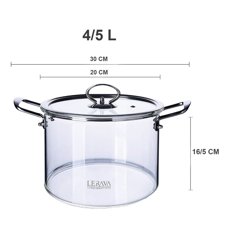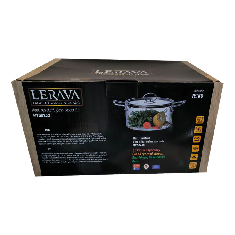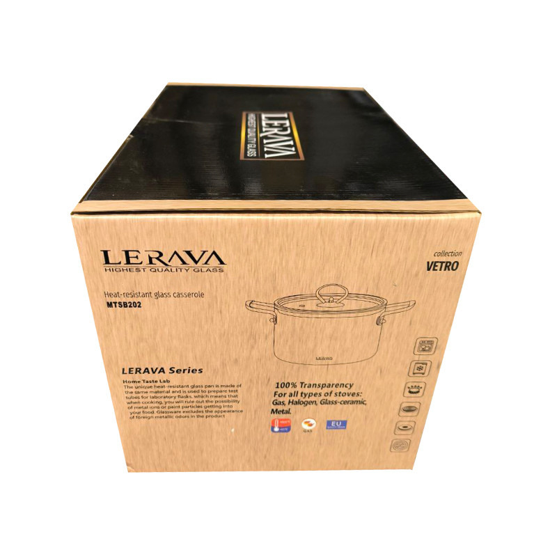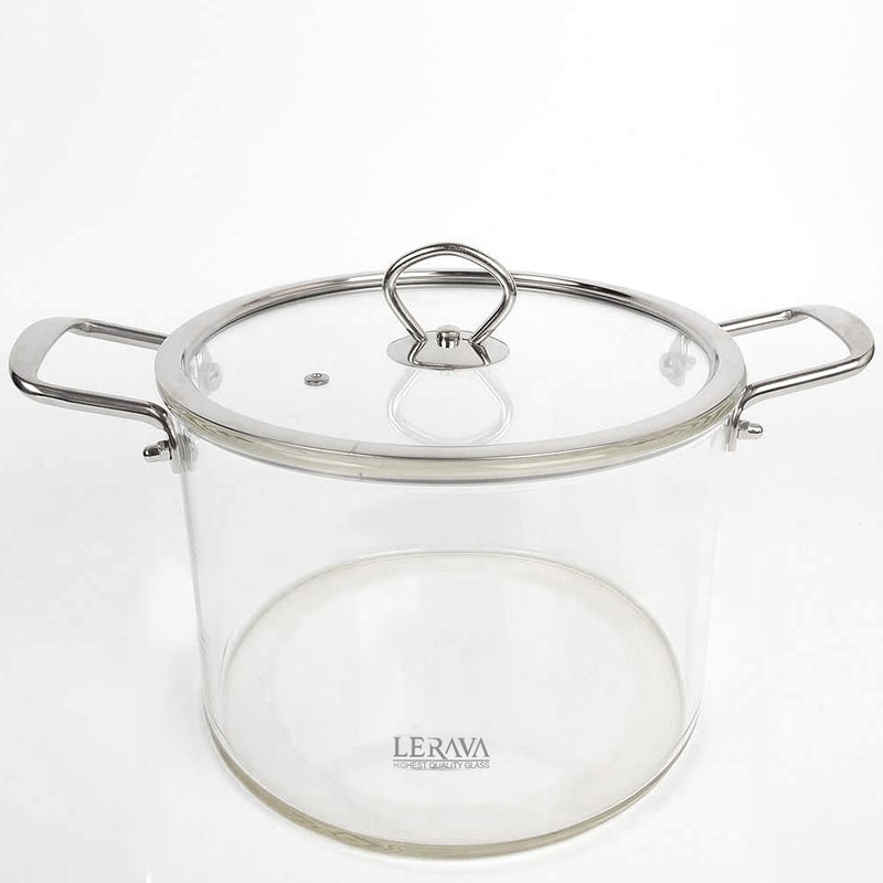 لراوا تولید کننده ی برتر ظروف پیرکس میباشد.قابلمه این برند دارای جنس بدنه و در پیرکس شفاف و ضخیم است - قطر دهانه آن ۲۰ سانتی متر,ارتفاع آن بدون در حدود 16/5 سانتی متر و حجم آن حدود 4/5 لیتر است - جنس دسته ها از استیل می باشد و دارای سوراخ خروج بخار روی در است.این قابلمه قابل استفاده روی انواع شعله ی مستقیم , داخل فر , روی اجاق برقی با صفحه المنتی و داخل فریزر است.(نکته: ظرف خالی از غذا را روی شعله رها نکنید و از وارد کردن شوک حرارتی سریع از سرد به گرم و برعکس خود داری نمایید)