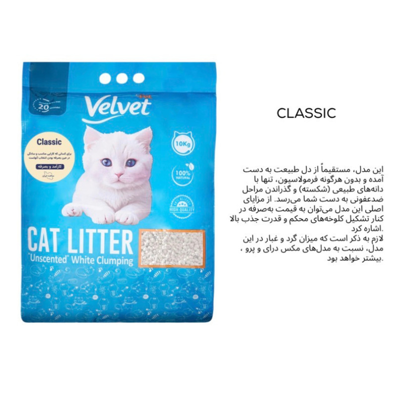 خاک Classic از سفیدترین و بادوامترین بنتونیت درجه ۱ تولید شده و دانهبندی آن ترکیبی از ریز تا درشت است. این مدل بهعنوان گزینهای اقتصادی و مقرونبهصرفه از برند Velvet عرضه میشود و انتخابی مناسب برای کسانی است که کیفیت پایدار و عملکرد مطمئن میخواهند، بدون اینکه هزینهی بالای مدلهای حرفهای را پرداخت کنند