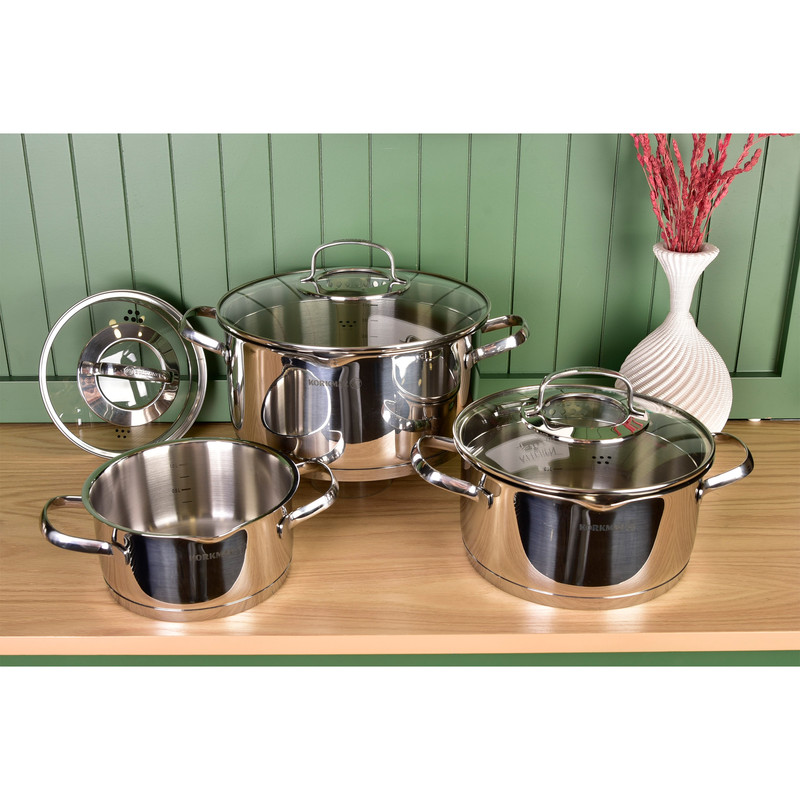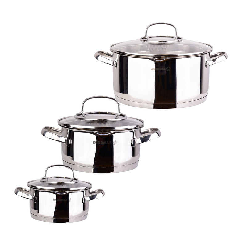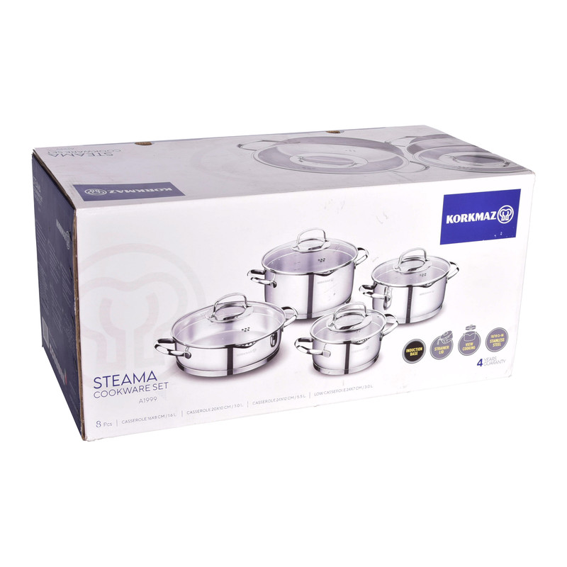 سرویس قابلمه کرکماز Steama A1999 یکی دیگر از سرویسهای پخت و پز برند کرکماز میباشد. بدنه این سرویس از استیل ضد زنگ 18/10 (Cr-Ni 18/10 stainless steel) ساخته شده است. این نوع استیل حاوی 18 درصد کروم و 10 نیکل میباشد. همچنین سطح قابلمهها برای درخشندگی بیشتر به صورت دقیق صیقل داده شده که زیبایی خاصی به قابلمهها داده است. سرویس قابلمه استیل کرکماز دارای 4 عدد قابلمه با ظرفیتهای 1.6، 3، 3 و 5.5 لیتر و به ترتیب با ابعاد 24×7 ،20×10 ،16×8 و 24×12 سانتیمتری میباشد. هر قابلمه دارای درب مخصوص به خود از جنس شیشه نشکن حرارت دیده است. دربهای سرویس قابلمه 8 پارچه کرکماز مجهز به صافی بوده و با تنظیم کردن مکان آن بر روی قابلمه میتوان آب داخل آن را خارج کرد. در داخل هر قابلمه نشانگر ظرفیت ایجاد شده است که در پیمایش مواد غذایی داخل آن به شما کمک خواهد کرد. دستگیره های سرویس قابلمه Steama A1999 از استیل ضد زنگ ساخته شدهاند که در برابر گرما مقاوم و نسوز میباشند.