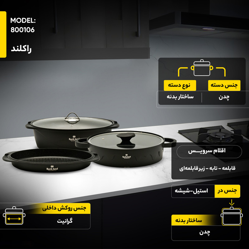 سرویس پخت و پز 21 پارچه راکلند یک مجموعه کامل و جامع است که با تنوع بینظیر ظروف، تمام نیازهای یک آشپزخانه حرفهای و خانگی را برآورده میکند. این سرویس که ساخت کشور ایران است، شامل چهار قابلمه در سایزهای مختلف، چندین تابه دو دسته، یک تابه دوطرفه رژیمی و یک تابه گریل است. اقلام کاربردی دیگری مانند زیرقابلمهای نیز در این مجموعه ۲۱ پارچه گنجانده شده است.