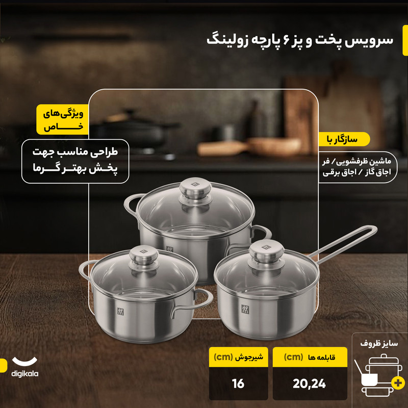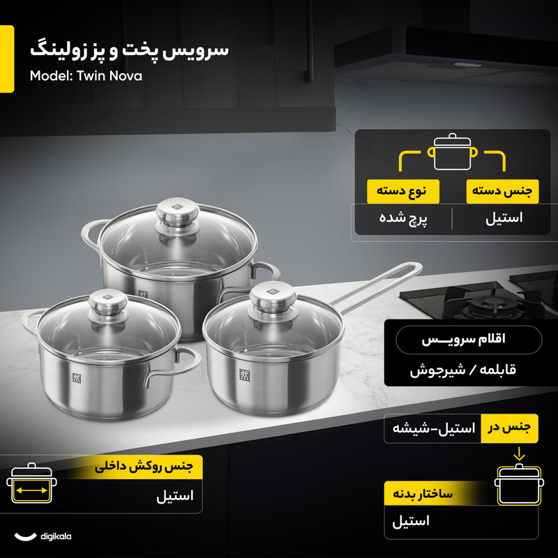 سرویس پختوپز ۶ پارچه زولینگ مدل Twin Nova ترکیبی از دقت مهندسی آلمانی و طراحی کاربردی است که برای آشپزی حرفهای و روزمره ساخته شده است. این سرویس قابلمه با بدنه و روکش داخلی از استیل مقاوم، انتقال حرارت یکنواخت و دوام طولانیمدت را تضمین میکند.