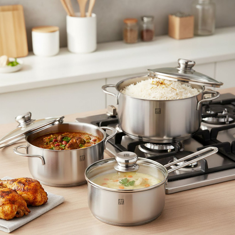در این مجموعه، اقلام سرویس شامل قابلمههایی در سایزهای ۲۰ و ۲۴ سانتیمتر و یک شیرجوش ۱۶ سانتیمتری است که تمام نیازهای پختوپز پایه را پوشش میدهد. ساختار دستههای استیل پرچشده علاوه بر استحکام، از داغ شدن بیش از حد در زمان استفاده جلوگیری میکند و کنترل ایمنتری را هنگام جابهجایی ظروف فراهم میسازد.