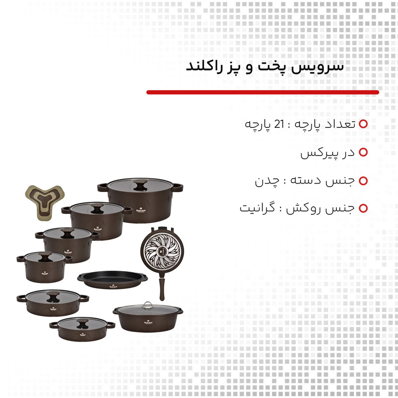 سرویس قابلمه راکلند یکی از جدیدترین، شیک ترین و باکیفیت ترین قابلمه های موجود در بازار می باشد. بدنه این سرویس از چدن مقاوم با پوشش داخلی گرانیت ضدخش می باشد. این قابلمه دارای 21پارچه کاملا کاربردی و مصرفی می باشد که نیاز هر آشپزخانه ای می باشد که برای هر تعداد میهمان مناسب است. در ادامه می توانید ترکیبات سرویس را با جزئیات مشاهده کنید.