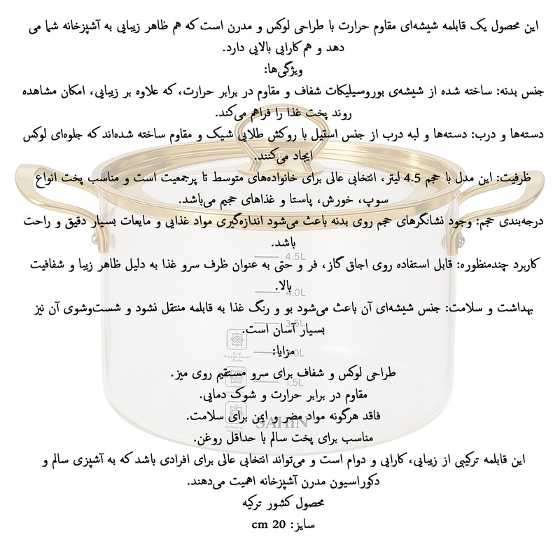 دستهبندی: قابلمه و تابهطراحی مناسب جهت پخش بهتر گرما: داردابعاد: 20x20x13 سانتیمتروزن: 1300 گرمسایز: 20ویژگیهای خاص : طراحی مناسب جهت پخش بهتر گرما , نچسبجنس بدنه : پیرکسجنس روکش داخلی : پیرکسجنس دسته : استیلتعداد دسته : دو عددسازگار با : وارمر , آتش , ماشین ظرفشویی , اجاق گاز , یخچالقابل شستوشو : با ماشین ظرفشویی , با دستکشور مبدا : ترکیهنوع : قابلمهنمایش بیشتر