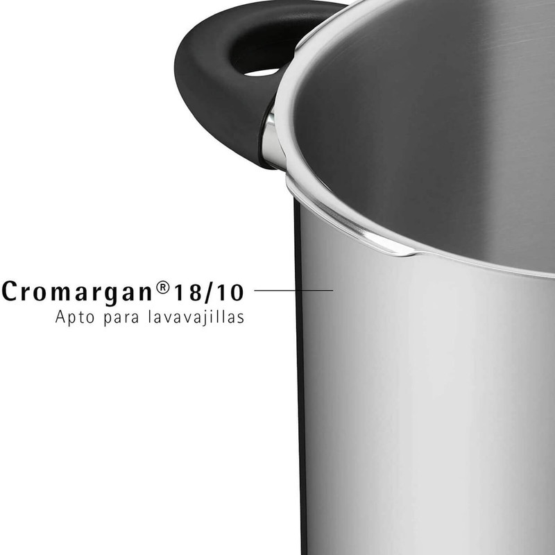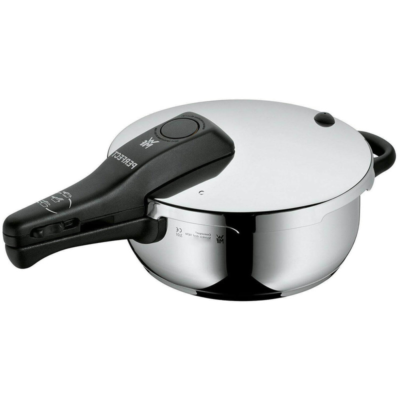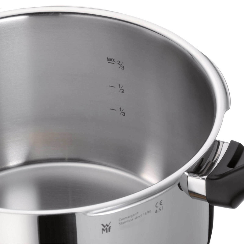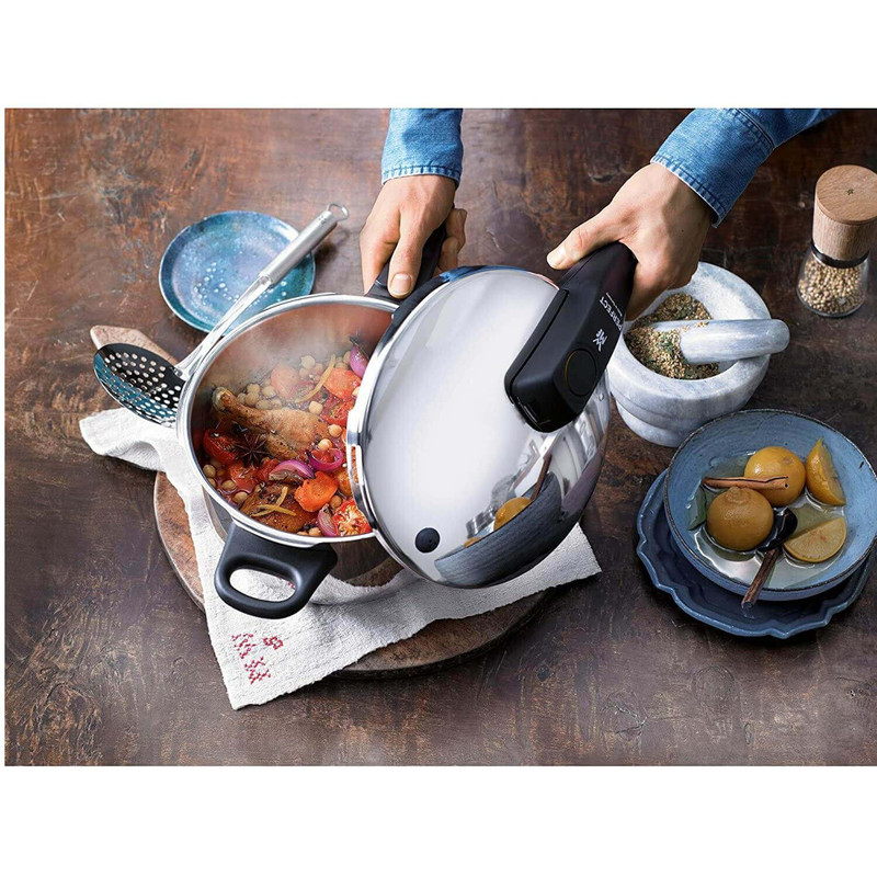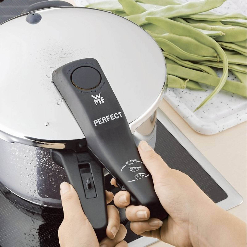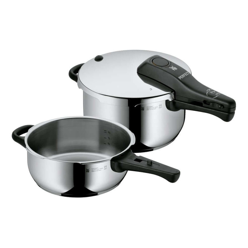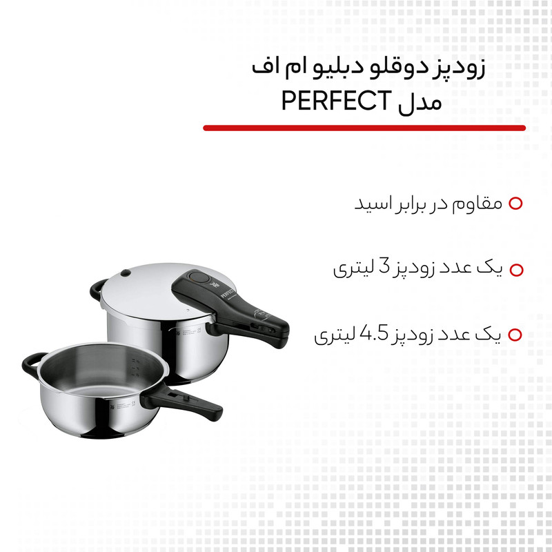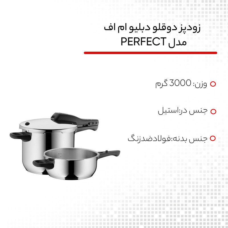 زودپز دوقلو WMF مدل Schnellkochtopf-Set 2-teilig Perfect 3L-4,5 L خروج خودکار بخار و ایمنی فشار باقی مانده برای باز شدن درب را فراهم می کند . این سرویس شامل یک زودپز 3 لیتر و یک زودپز 4.5 لیتر و یک دسته همراه درب مشترک می باشد که داخل زودپز مقیاس اندازه گیری درج شده است تا آشپزی را راحت کند . نشانگر سازگاری با 2 کد رنگی برای تنظیم پخت و پز (110 درجه سانتیگراد/119 درجه سانتی گراد) . دسته درب قابل جدا شدن جهت نظافت ساده است . جنس فولاد ضد زنگ Cromargan ضد زنگ 18/10 قابل شستشو در ماشین ظرفشویی ، تمیز کردن آسان ، ایمن در فر ، بی مزه ( مزه غذا در این قابلمه ها تغییر نمی کند ) و مقاوم در برابر اسید می باشد . تهیه غذا در زودپز مدرن ، سریع و سالم است . فشار شدید و دمای بالا ، زمان پخت معمولی را تا 70 درصد کوتاه می کند . با صرفه جویی همزمان انرژی در حدود 50 درصد از ویتامین ها ، مواد مغذی و مواد معدنی تا حد زیادی با پخت ملایم حفظ می شوند و غذاها مقوی و خوشمزه هستند . قابلمه های پرسرعت تقریباً برای تهیه همه غذاها و سبزیجات ، گوشت و ماهی ، غلات و حبوبات ، سوپ ها و خورش ها مناسب هستند . طراحی کلاسیک آن جاودانه است و عملکرد آن همیشه با جدیدترین فناوری مطابقت دارد .