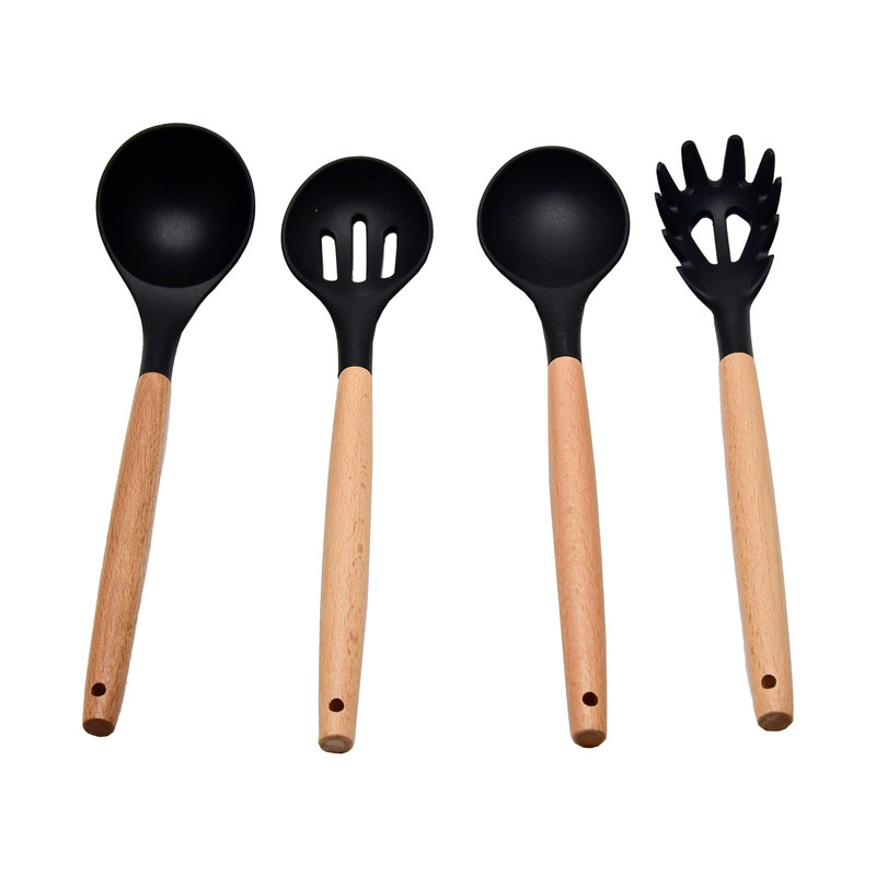 سایر توضیحات : دارای اقلام: کفگیر پختوپز چنگال پختوپز ملاقه همزن کفگیر کیک قاشق سالاد چنگال سالاد قاشق پختوپز انبر دارای دسته چوبی بامبو سر سیلیکونی نسوز طراحی اروپایی رنگبندی متنوع