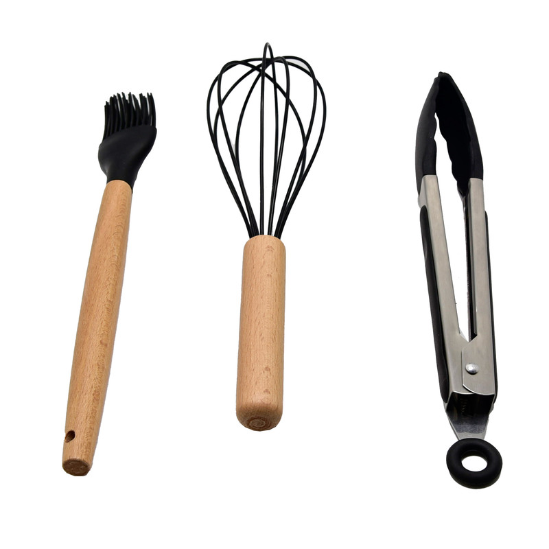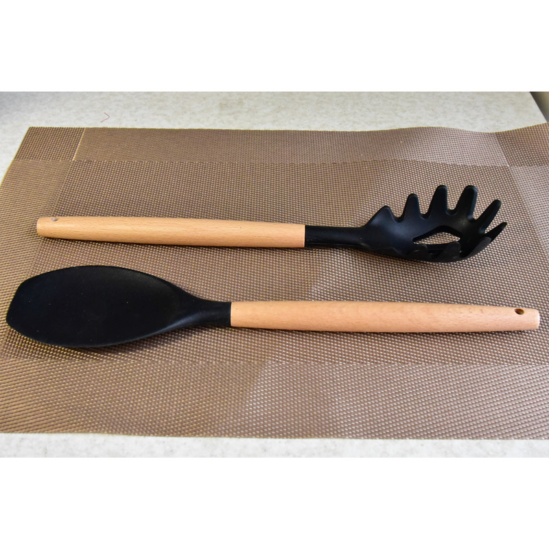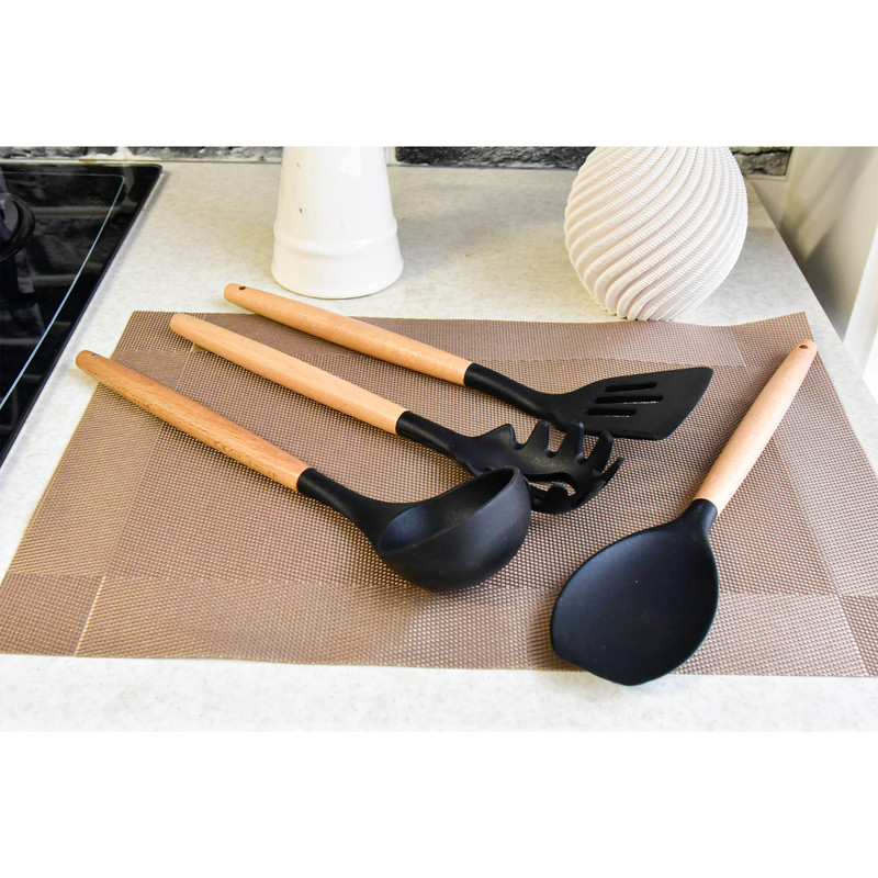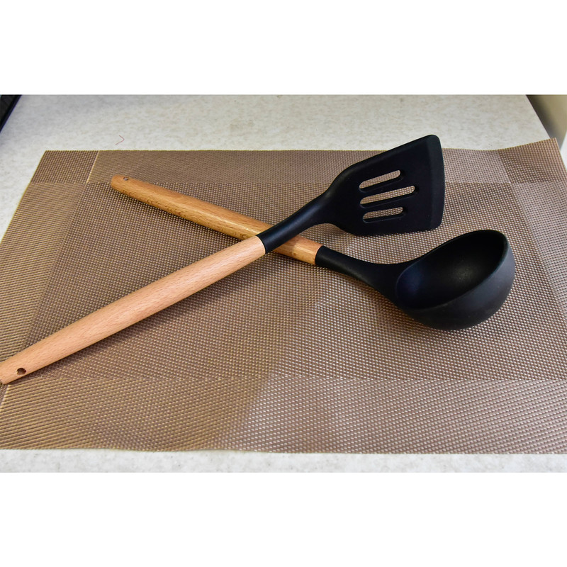 سرویس کفگیر Kitchen Set ساخته شده از با کیفیت ترین مواد سیلیکون با استاندارد FDA و بدون BPM ، دسته های چوبی از جنس بامبو و یک ظرف نگهدارنده از جنس پلاستیک میباشد. این سرویس از وزن متعادل و دیزاین منحصر بفردی برخوردار است که باعث میشود در دست گرفتن آن آسان و پخت و پز را راحت می کند. سیلیکون به کار رفته در این محصول ساخته شده از مواد غیر سمی ، بی بو و سازگار با محیط زیست است. این مجموعه وسایل آشپز خانه در برابر درجه حرارت سرما تا 30- و گرما 230+ درجه سانتی گراد مقاومت دارد. انعطاف پذیری ، رویه های نرم از خراشیدن و آسیب رساندن به ظروف شما جلوگیری میکند و همچنین باعث کاهش سر و صدا هنگام آشپزی می شود. این مجموعه متشکل از 11 عدد کفگیر ملاقه و 1 عدد ظرف نگهداره می باشد.