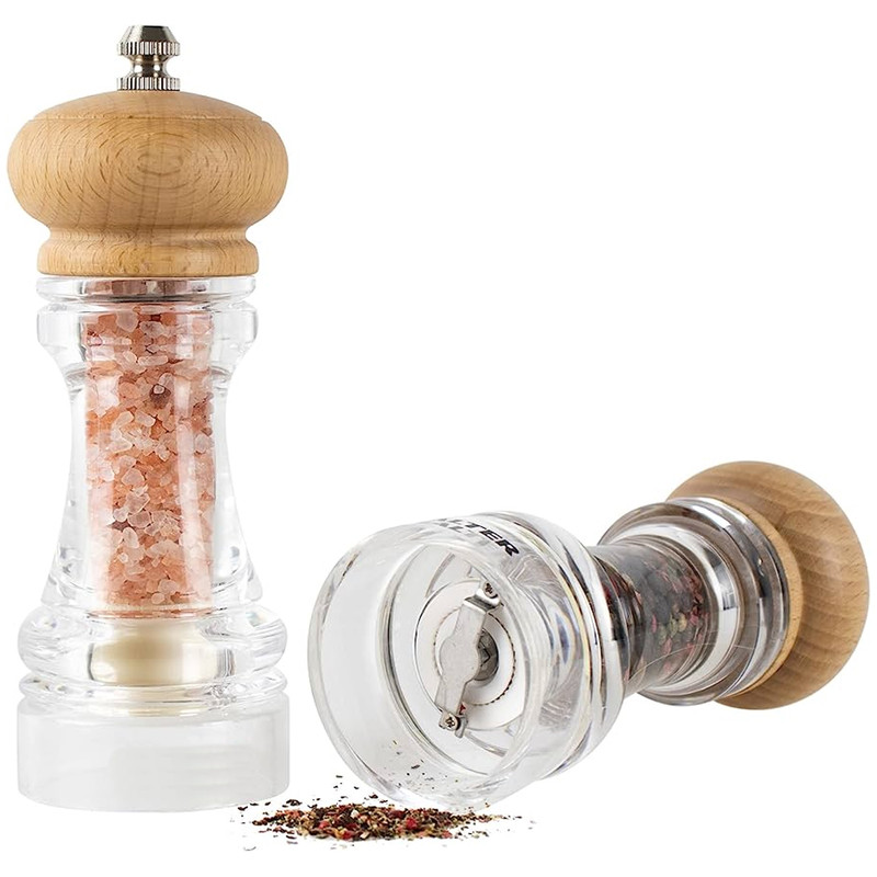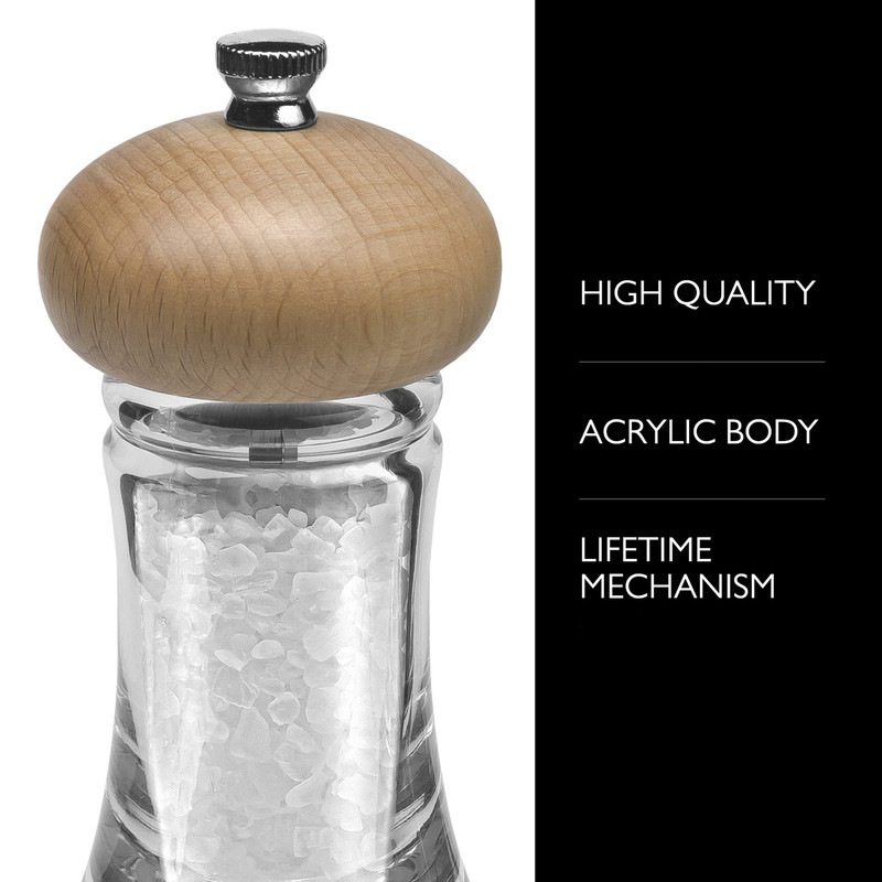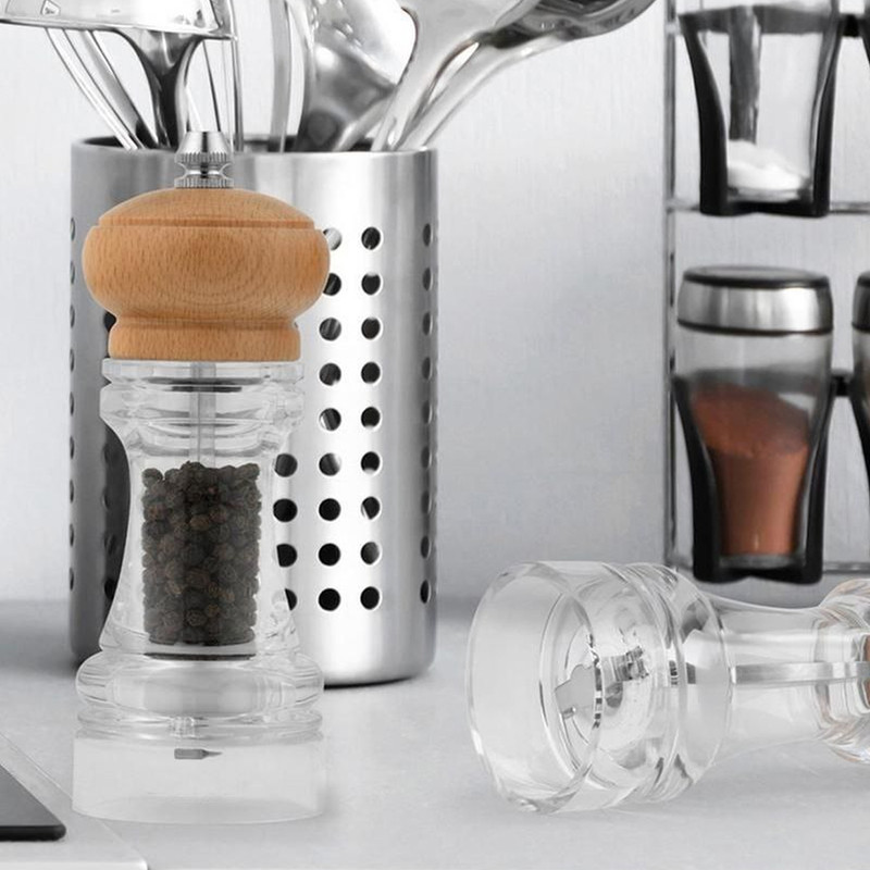 نمک و فلفل ساب مدل CRYSTAL کد 910130 محصولی کاربردی و با کیفیت است که می تواند زینت بخش سفره شما به هنگام پذیرایی باشد. بدنه این ابزار از اکرولیک شفاف و با کیفیت و چوب رابر ساخته شده است و در حدود 17 سانتیمتر ارتفاع دارد. برای پرکردن کافیست تا درپوش فلزی پیچی بالای ابزار را باز کرده و مخزن آن را از میزان دلخواه دانه فلفل، نمک یا دیگر انواع ادویه جات پر نمایید. قسمت خردکن و تیغه آن از جنس سرامیک بسیار با کیفیت و برنده ساخته شده است که در صورت استفاده صحیح سالها دوام خواهد داشت. دقت داشته باشید که وجود خط و خش جزئی در بخش های مختلف این کالا به دلیل نوع جنس غیر قابل اجتناب بوده و بخشی از ماهیت کالا می باشد.