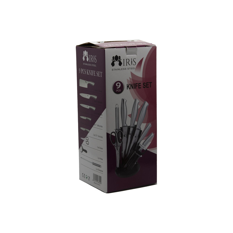 سرویس کارد 9 پارچه IRIS شامل 5 سایز کارد در سایزهای مختلف که از دم دستی تا سایز بزرگ برای سبزیجات و ساطور تشکیل شده که برای رفاه حال خریداران یک عدد تیزکن / یک عدد پوست کن و یک عدد قیچی نان /گوشت و سبزی هم در این سرویس گنجانده شده است . این سرویس کارد ساخت کشور چین که در ساخت و تولید این محصول از بهترین متریال استفاده شده است . پایه این سرویس کارد به صورت گردان تعبیه شده که از زیبایی خاصی برخوردار میباشد.