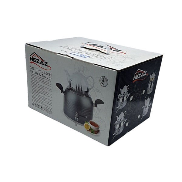 ست کتری و قوری نزاز کد 3029 :نزاز نام یکی از برند های تولیدکننده کتری و قوری به شمار می رود که برای تولید این محصولات از استیل ضد زنگ استفاده می کند. این برند مطرح ایرانی از ورق استیل 18:8 با نیکل 304 برای تولید محصولات خود استفاده می کند. بدنه کتری های این برند معمولاً یک تکه هستند و این امر موجب می شود که کتری های این برند چنانچه بدون آب روی شعله قرار بگیرند نسوزند و سوراخ نشوند. لازم به ذکر است که کتری های خارجی به علت دو تکه بودن بدنشان امکان سوراخ شدنشان بسیار بالا است. این کتری ها دارای قابلیت جذب رسوبات و املاح هستند و به همین خاطر مصرف آن ها منجر به جلوگیری از ابتلا به بیماری های سنگ کلیه و مثانه می شود.