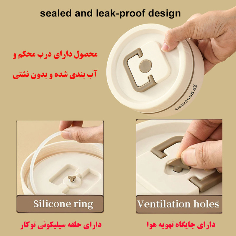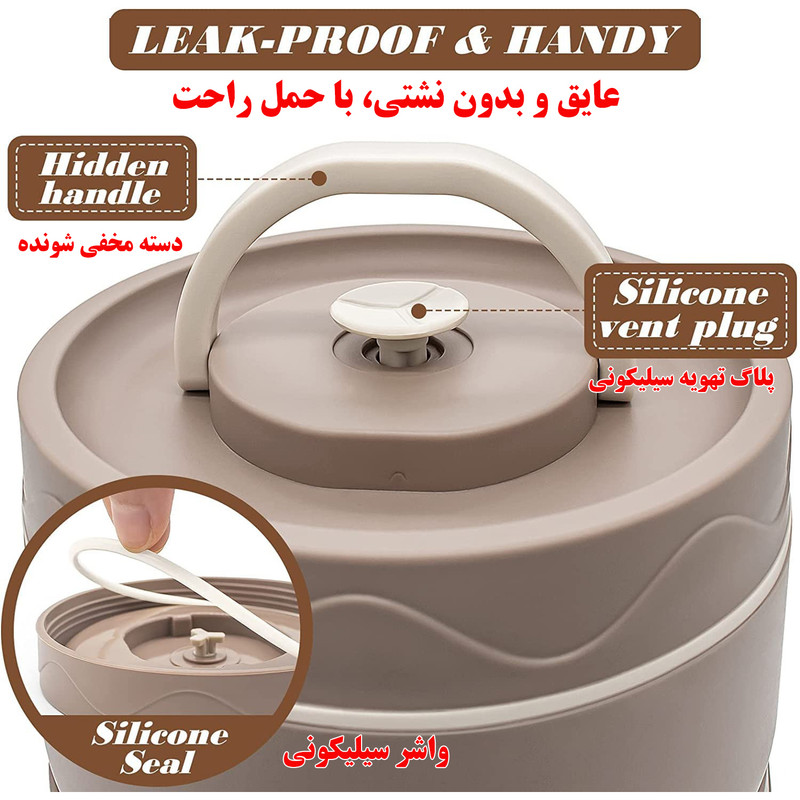 مهمترین دغدغه هنگام حمل غذا، جلوگیری از نشت آن است. این ظرف با طراحی کاملاً آببندی شده، این نگرانی را برای همیشه برطرف میکند. درب محکم آن مجهز به یک واشر سیلیکونی انعطافپذیر است که به طور کامل دهانه ظرف را پوشانده و از هرگونه نشتی، حتی هنگام حمل سوپ و مایعات، جلوگیری میکند. علاوه بر این، یک جایگاه تهویه هوای سیلیکونی روی درب تعبیه شده که به شما اجازه میدهد قبل از باز کردن، بخار اضافی را خارج کرده و درب را به راحتی باز کنید. برای سهولت در حمل، یک دسته محکم و مخفی شونده نیز بر روی درب طراحی شده است که در مواقع عدم نیاز، به صورت صاف روی درب قرار میگیرد. این محصول در دو سایز کاربردی ۴۰۰ و ۶۰۰ میلیلیتری عرضه میشود تا بتوانید بر اساس نیاز خود، بهترین گزینه را انتخاب کنید. به همراه این ظرف، یک کیف عایق ضخیم و باکیفیت نیز ارائه میشود که نه تنها زمان حفظ گرما را افزایش میدهد، بلکه حمل آن را نیز آسانتر و شیکتر میسازد.