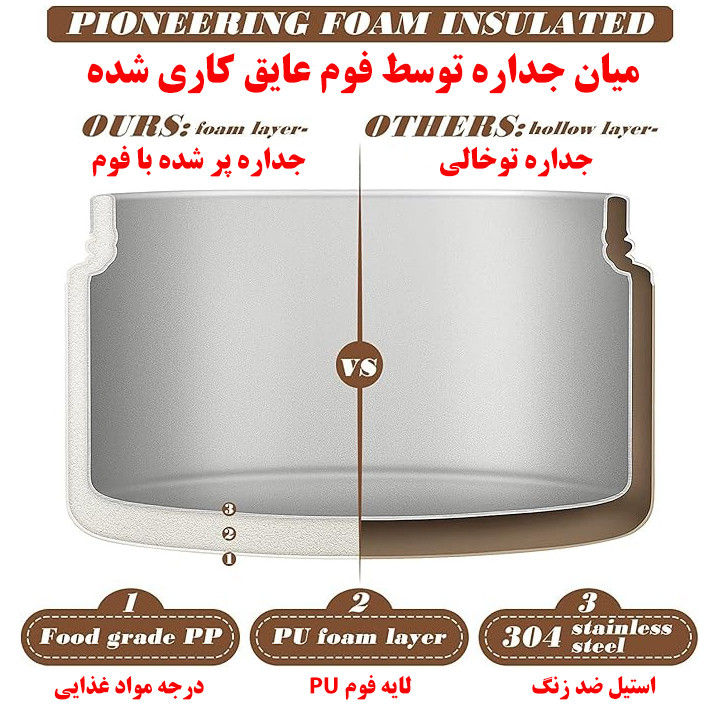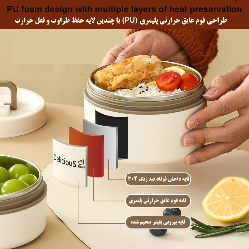 راز کارایی بینظیر این ظرف در ساختار چندلایه و پیشگام آن نهفته است. برخلاف ظروف معمولی با جداره توخالی، دیواره داخلی این محصول با یک لایه فوم حرارتی پلیمری (PU) به طور کامل پر شده است. این نوآوری، یک سد قدرتمند در برابر تبادل دما ایجاد کرده و حرارت غذای شما را برای مدت زمانی طولانی قفل میکند. لایه داخلی از فولاد ضد زنگ ۳۰۴، که بهترین انتخاب برای تماس با مواد غذایی است، ساخته شده تا سلامت، طعم و بوی غذای شما بدون هیچ تغییри حفظ شود. لایه بیرونی نیز از پلیمر ضخیم شده و باکیفیت ساخته شده که علاوه بر زیبایی، به دوام و کارایی کلی ظرف میافزاید.