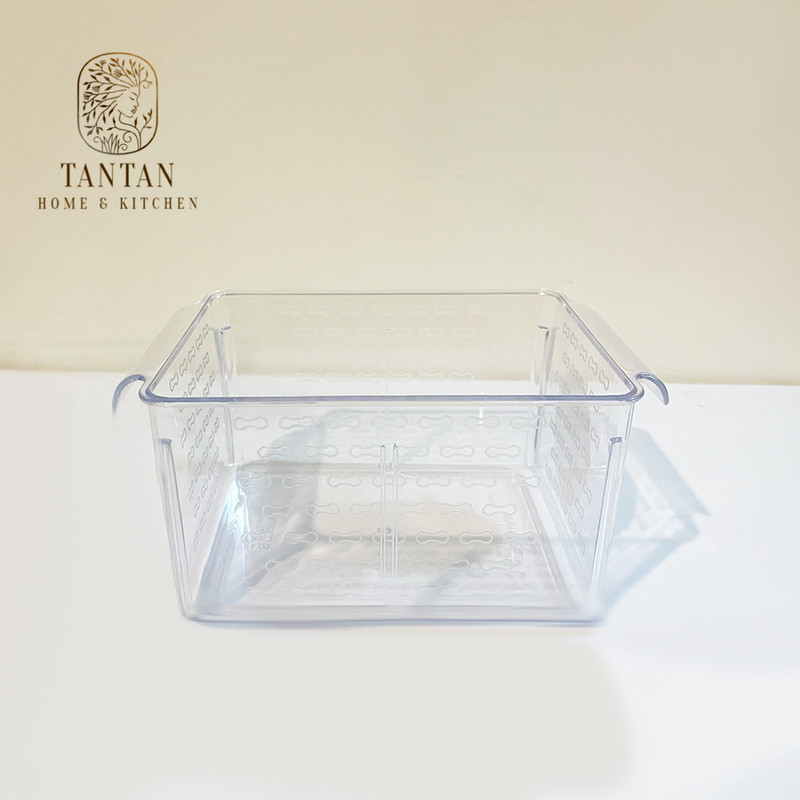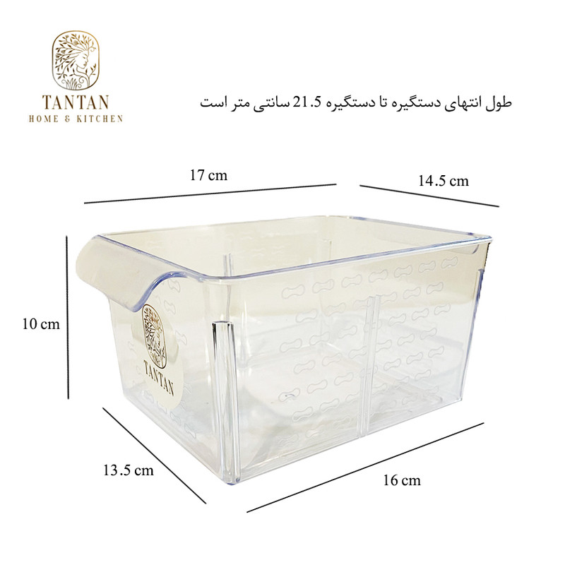 سبد نظم دهنده یخچال تن تن طرح کریستال سایز 1 ساخته شده از مواد درجه یک بوده و جنس بدنه آن پلاستیک کاملا شفاف و مقاوم میباشد. ابعاد این محصول طول انتهای دستگیره تا دستگیره 21.5 سانتی متر و عرض 14.5 سانتی متر در ارتفاع 10 سانتی متر است که دو عدد دسته در طرفین برای راحتی در حمل و جابجایی در آن تعبیه شده است. ابعاد دقیق سبد عبارتند: از قسمت بالا طول 17 عرض 14.5 و قسمت پایین طول 16 عرض 13.5 سانتی متر