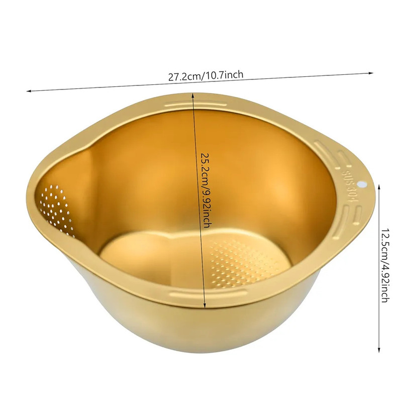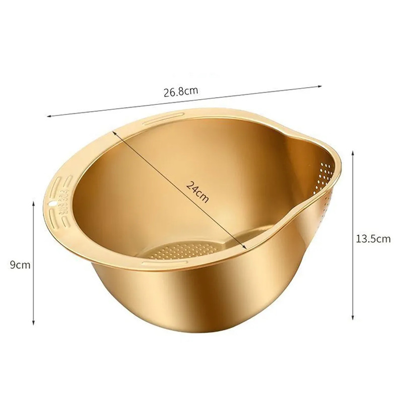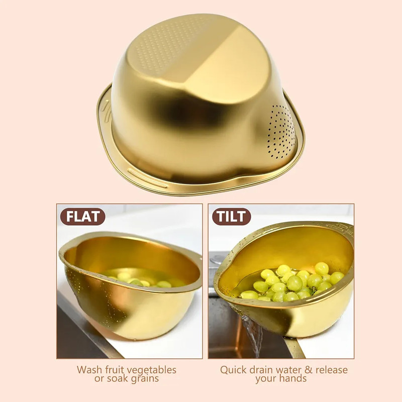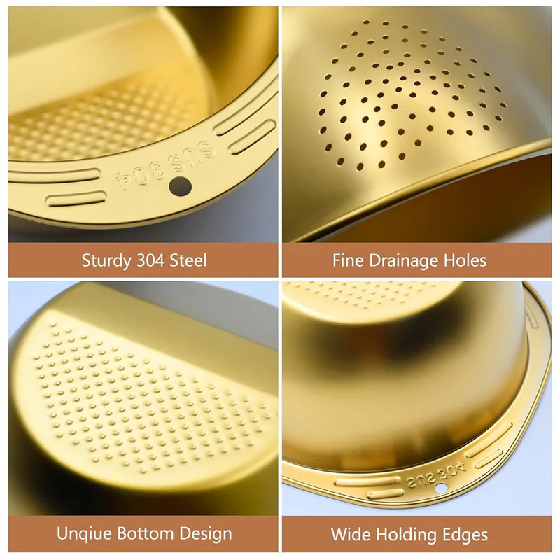 این آبکش طلایی از استیل نگیر 304 باکیفیت ساخته شده که مقاوم در برابر زنگزدگی، خوردگی و تغییر رنگ است. طراحی آن بهصورت دو طرفه بوده و یک بخش دارای سوراخهای ریز برای آبکشی برنج، سبزیجات و میوه است و بخش دیگر برای نگهداری و شستشو بدون ریزش آب. رنگ طلایی براق آن جلوهای لوکس و مدرن به آشپزخانه میبخشد.